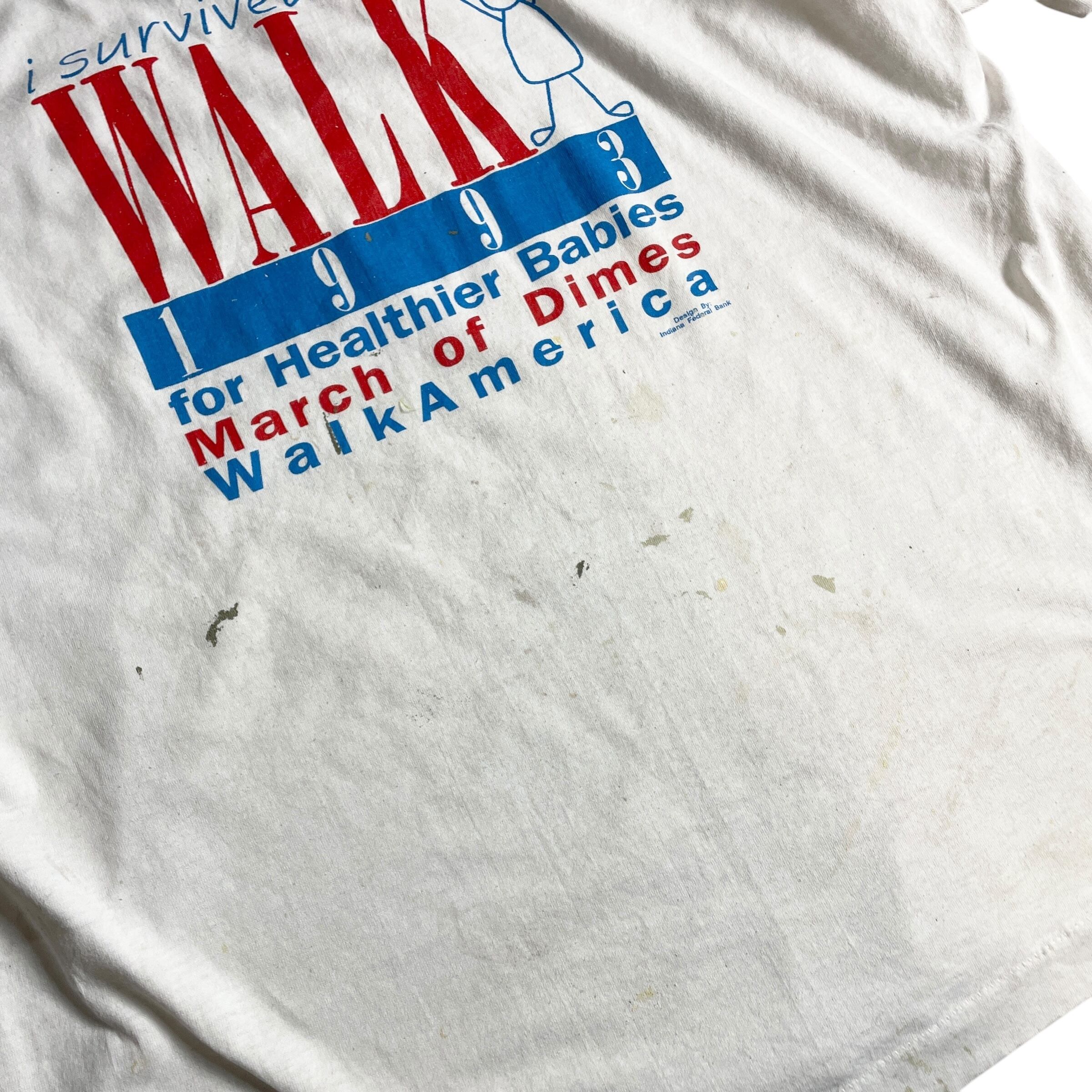 1993年にアメリカで開催されたチャリティーウォーキングイベント「WalkAmerica」の記念Tシャツ。「i survived the WALK」のユニークなコピーと、手書き風のスティックフィギュアがどこかほっこりする、心温まる一枚。