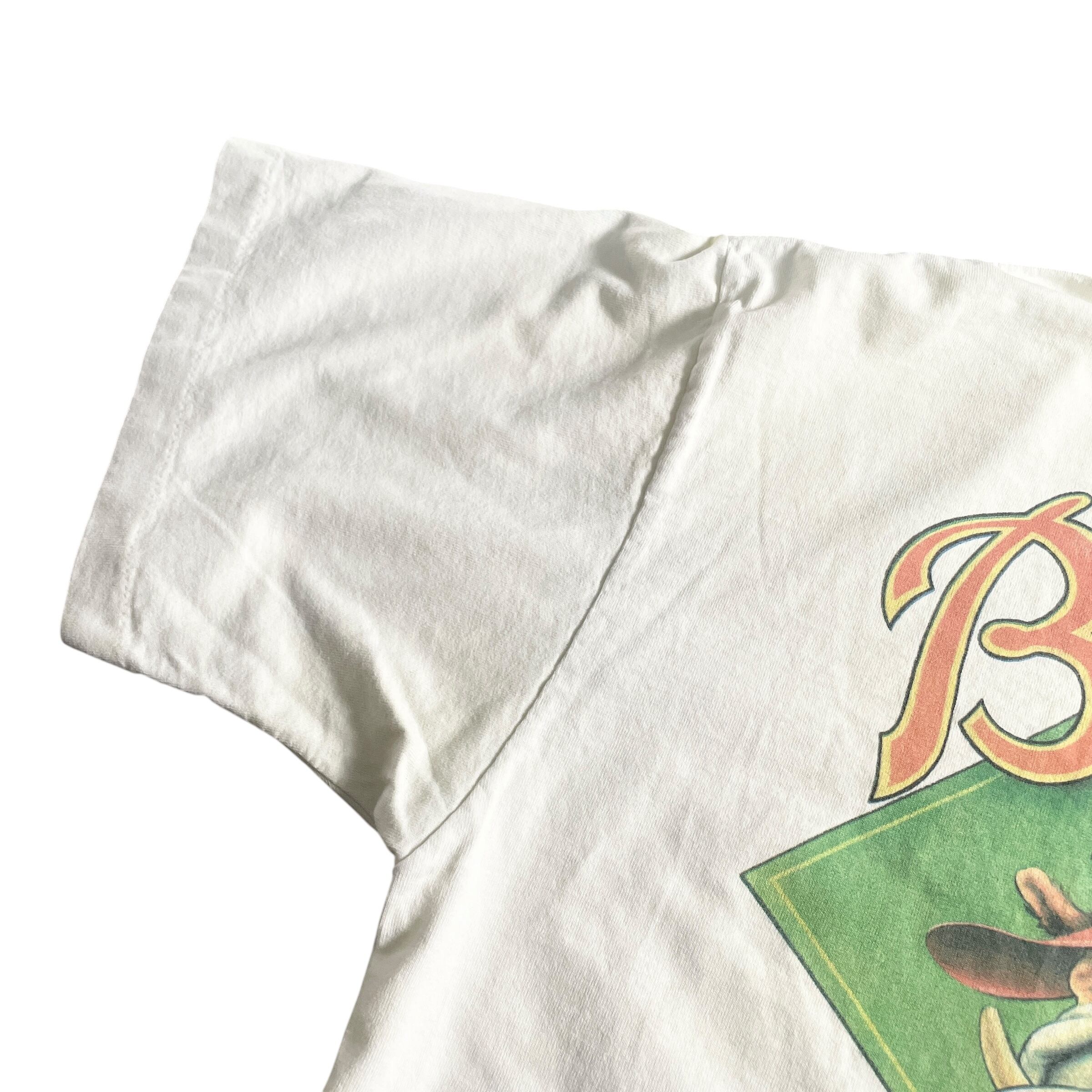コミカルだけど緻密に描き込まれたイラストは、ただのギャグにとどまらずアートピースとしても秀逸。右下の「Always a leg up on the competition!」のセリフも、さりげなく効いてます。ソフトボールをテーマにしながら、スポーツ&カルチャーが融合したようなユニークさが魅力。ヴィンテージ ビンテージ tシャツ シングルステッチ