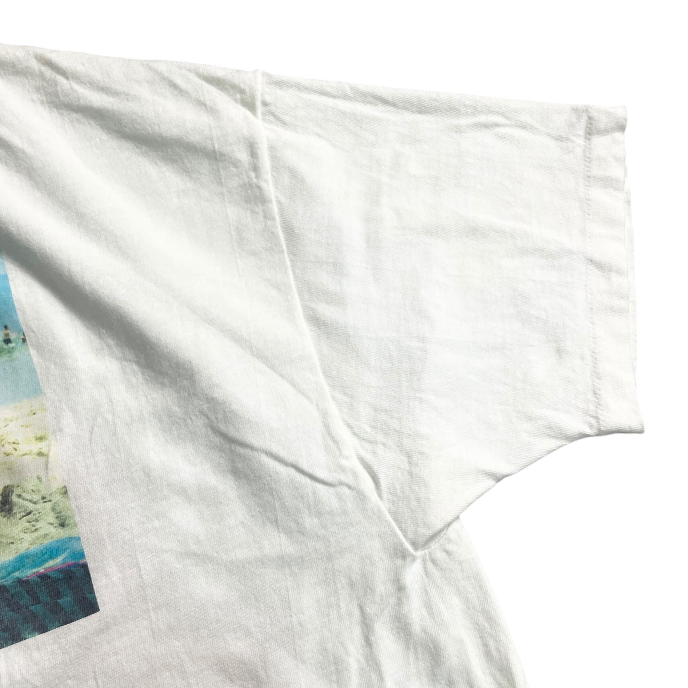 90年代〜00年代のアメリカ土産系カスタムTシャツの名残を感じさせる、バースデーフォトプリントT。砂浜で遊ぶベビーのスナップに、手描き風の「HAPPY BIRTHDAY」レタリングが刺さる一枚。プリントのゆるさ、色褪せ具合も◎で、フォトT好きなら外せない“外し”の名品。カワイイのに、どこかシュール。このアンバランスがクセになるヴィンテージT。