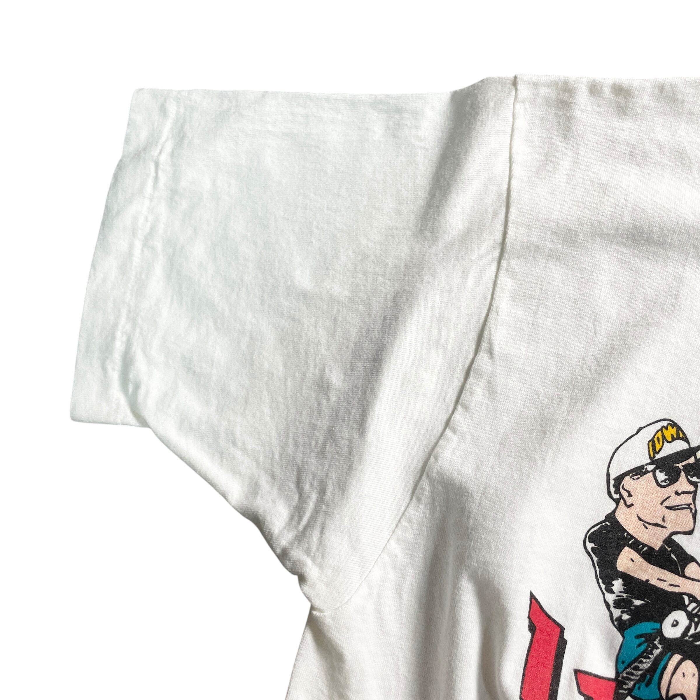 なんともユニークで味わい深いこちらの一枚は、「11th Annual Hawkeye Cruise(第11回 ホークアイ・クルーズ)」の記念Tシャツ。キャラクター調で描かれた釣り人は、アメリカン・カレッジフットボール界のレジェンドコーチ、**Hayden Fry(ヘイデン・フライ)**本人。サングラスとキャップ姿で大物を釣り上げるシーンが描かれており、そのゆるさと勢いが絶妙に90年代っぽいノリです。