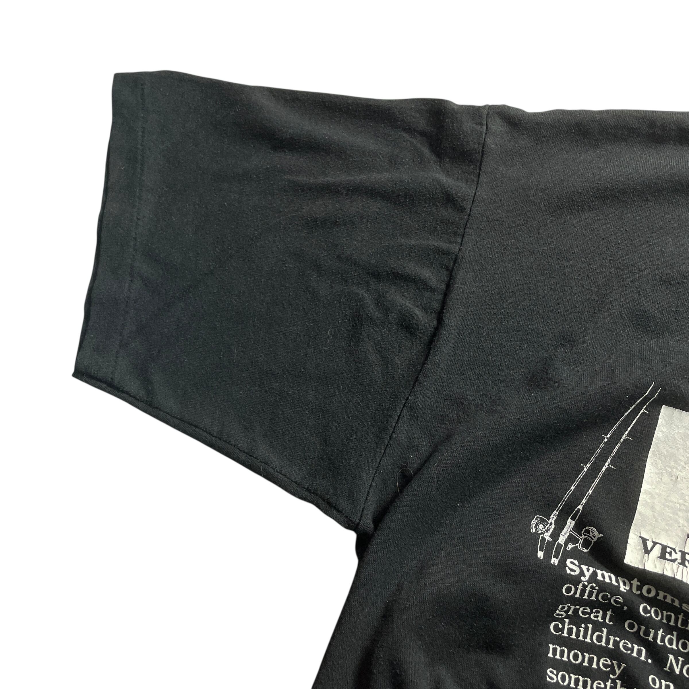 釣り好き男子、要注意!「WARNING FISHING FEVER」の強烈なインパクトから始まる、90年代ユーモア全開のグラフィックTシャツが登場。ブラックボディにホワイトプリント、でかでかと書かれた“VERY CONTAGIOUS TO ADULT MALES(成人男性に非常に感染しやすい)”の一文からもう最高。釣りに夢中すぎて「家庭も仕事もおざなりに…」という“症状”リストが、まるでTシャツ界の診断書のようにユーモラスにまとめられています。ヴィンテージ ビンテージ tシャツ シングルステッチ