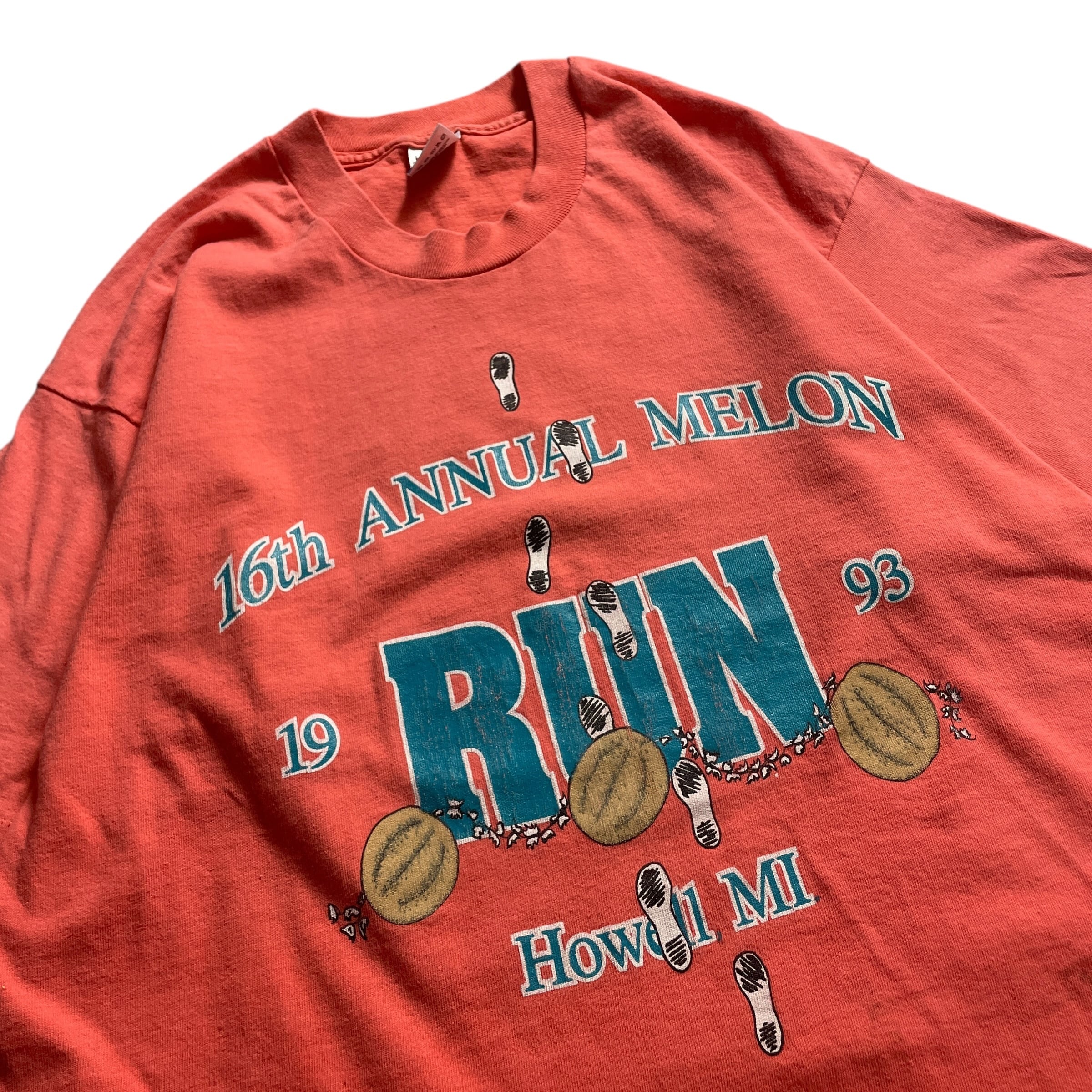 ミシガン州ハウエルのローカルイベント、1993年の「16th Annual Melon Run(第16回メロンラン)」記念Tシャツ。メロンの街らしく、スイカのグラフィックと足跡が大胆にあしらわれた、ローカルTの王道スタイル。レトロな赤系のボディに、ターコイズブルーの「RUN」の文字がインパクト大で、90年代らしいポップな配色もたまらないポイント。