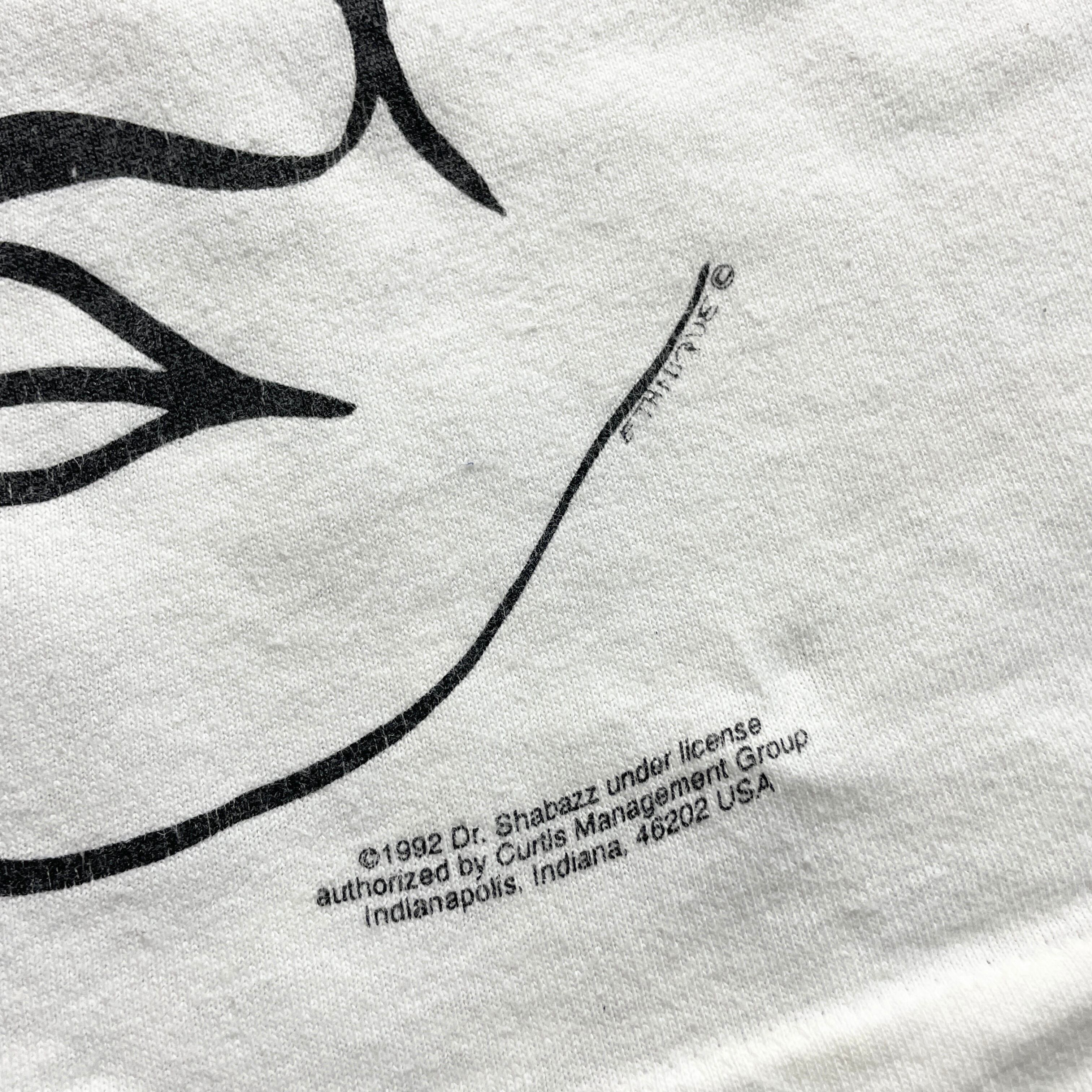 このTシャツはDr. Shabazz名義の公式ライセンスアイテムで、インディアナポリスのCuris Management Groupが管理。つまり、単なるファングッズではなく、当時のブラックカルチャー/ブラックパワームーブメントの延長線上で作られた歴史的背景のある一枚です。