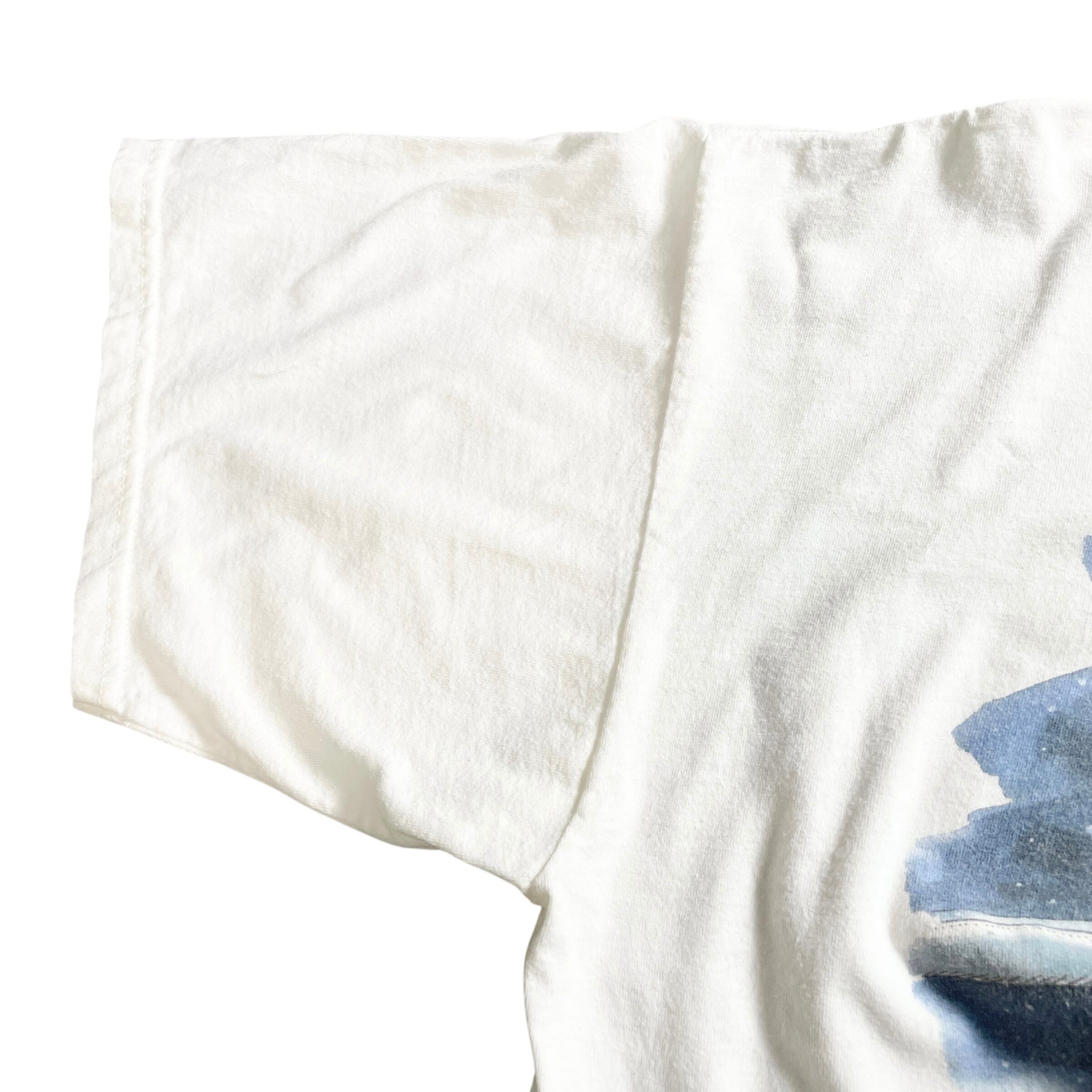 The Far Sideシリーズの中でも特にパンチの効いた一枚。飛行機の窓にサンタとトナカイが衝突する、ブラックユーモア全開の一枚です。ギャリ・ラーソンらしい毒っけのあるタッチがクセになる、クリスマスにあえて着たいTシャツ。タグはTULTEXのボディで、90年代らしい柔らかいコットンの質感も魅力的。アート。