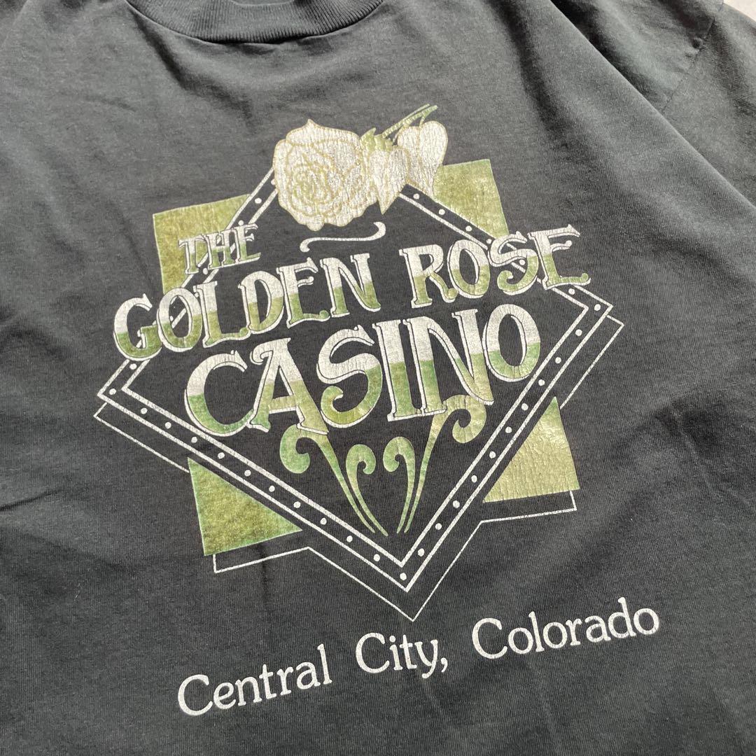 カジノの華やかさと少しの怪しさを詰め込んだ、“THE GOLDEN ROSE CASINO”のロゴT。グリーンとゴールドのグラデがきいたグラフィックは、中央シティ(コロラド州)に実在するカジノのもの。白バラとハートのワンポイントが、ギャンブルというより“ロマンスと運命”を感じさせるドラマチックな1枚。シンプルながらもロゴの立体感が絶妙。