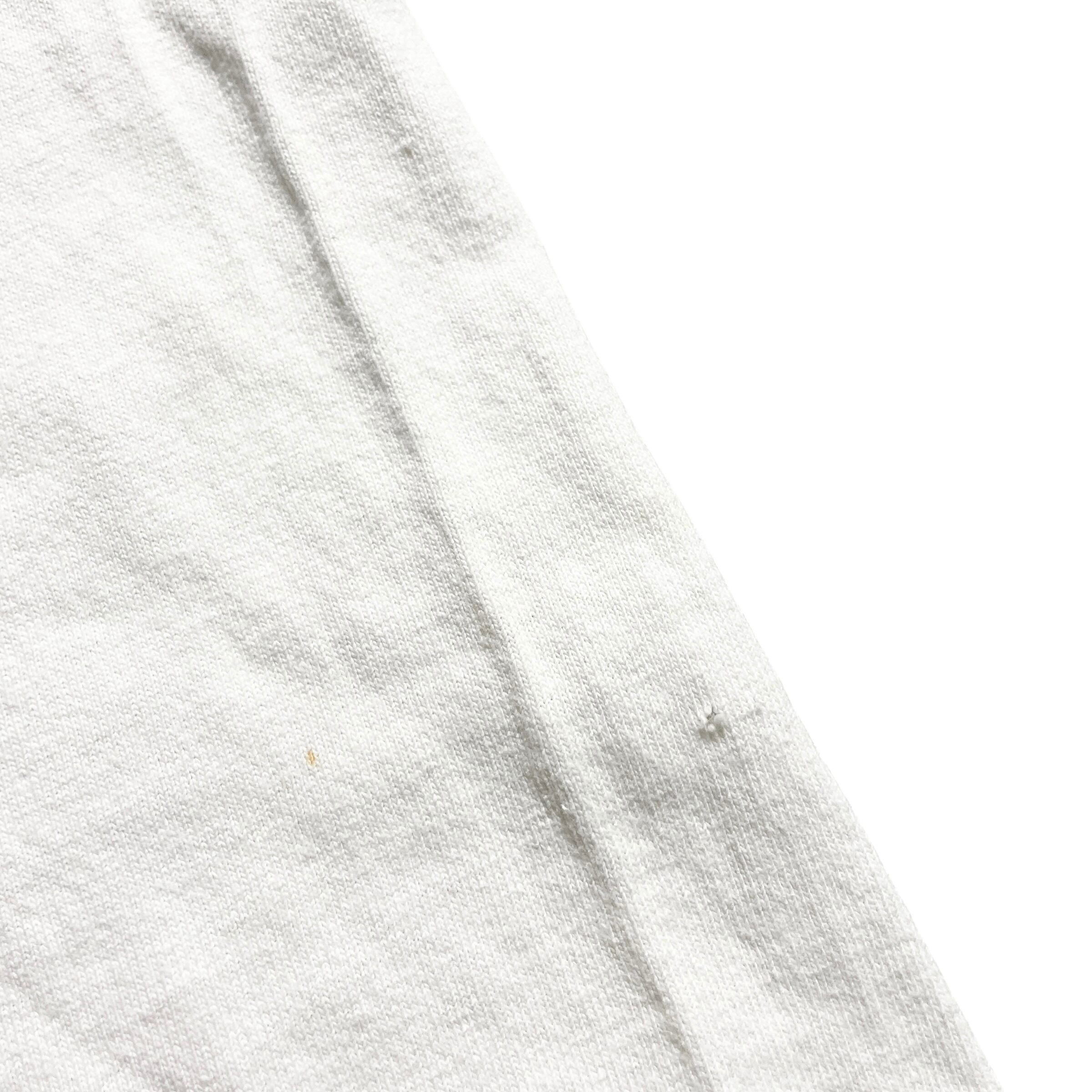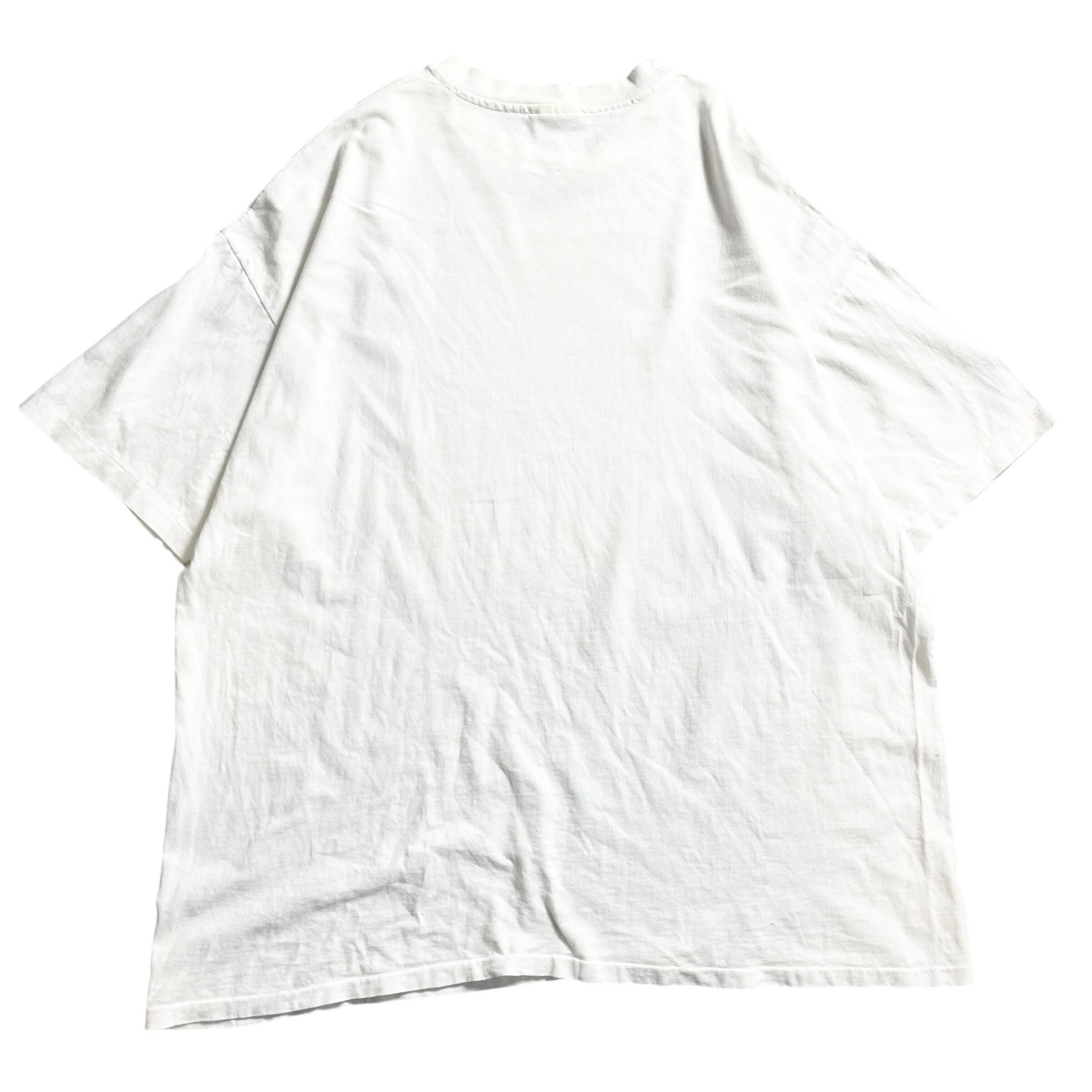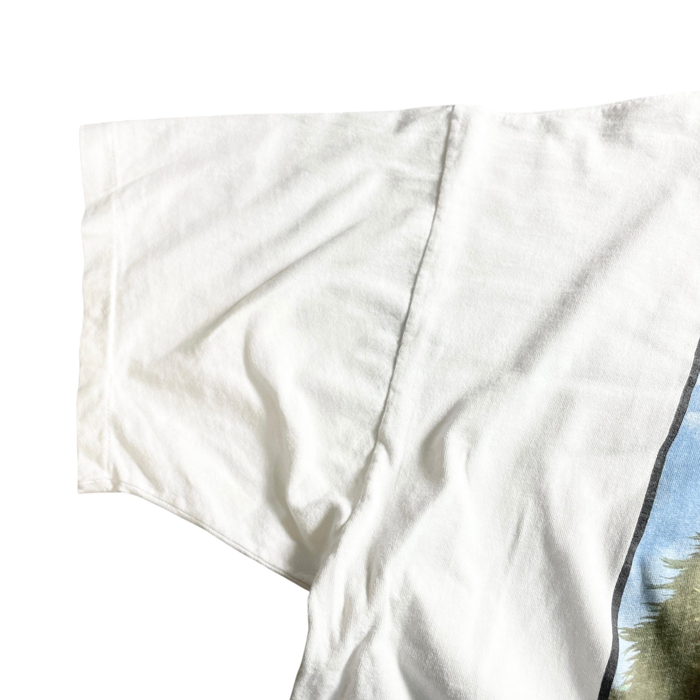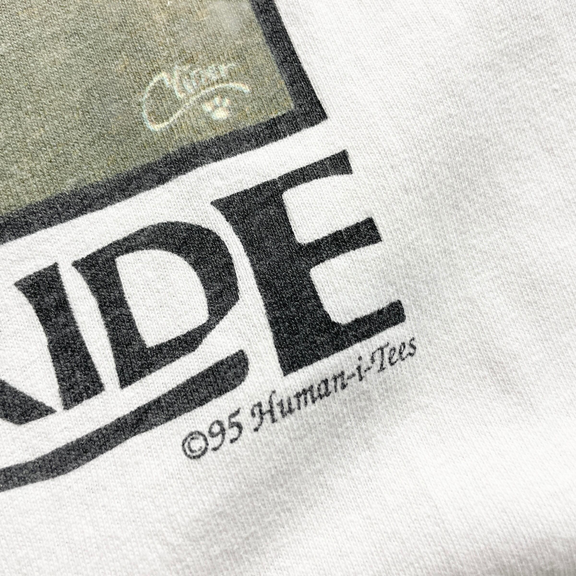 どっしりと構える百獣の王ライオンの姿が力強く描かれたグラフィック。背景の雲と空のブルー、ライオンの黄金色のたてがみが美しく調和したアートワークが印象的です。1995年コピー入りで、当時の動物モチーフTブームの空気感をしっかり纏っています。自然と野性の力強さを感じさせる1枚です。
