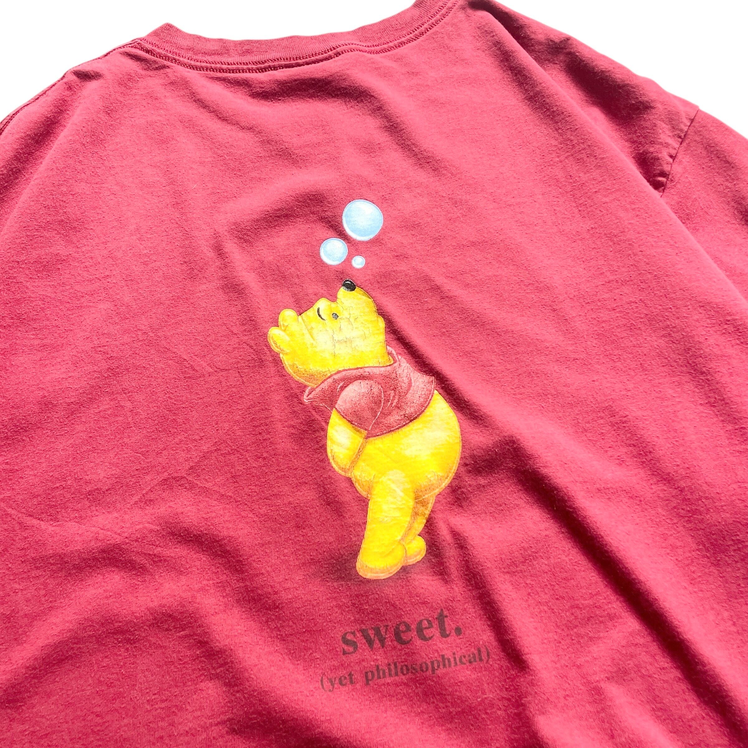 ディズニーの名キャラ、プーさんが泡を見つめるほのぼのとしたバックプリントに「sweet. (yet philosophical)」というフレーズが絶妙にマッチ。どこか哲学的でメルヘンな世界観が凝縮された、珍しいアートワークの一枚。くすんだ赤ボディとユーズド感も雰囲気抜群で、ディズニーファンのみならず刺さる一着です。ヴィンテージ ビンテージ tシャツ シングルステッチ