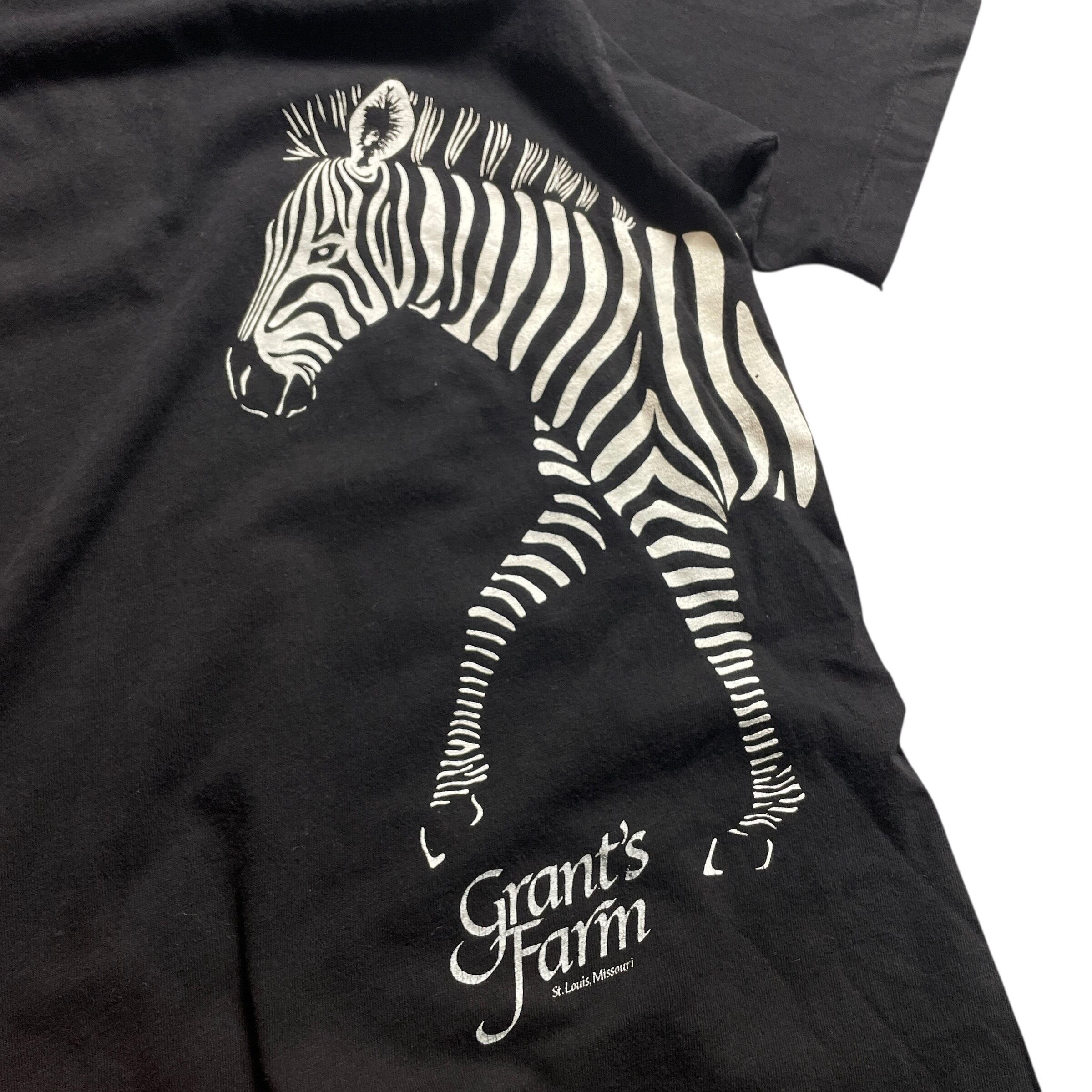 フロントからサイドにかけてシマウマのグラフィックが大胆にプリントされたインパクト大な一枚。セントルイスにある動物園「Grant’s Farm」のお土産Tシャツで、動物好きにはたまらないデザイン。ブラックボディに白のプリントが映えるので、シンプルながらも個性的なコーデの主役に。