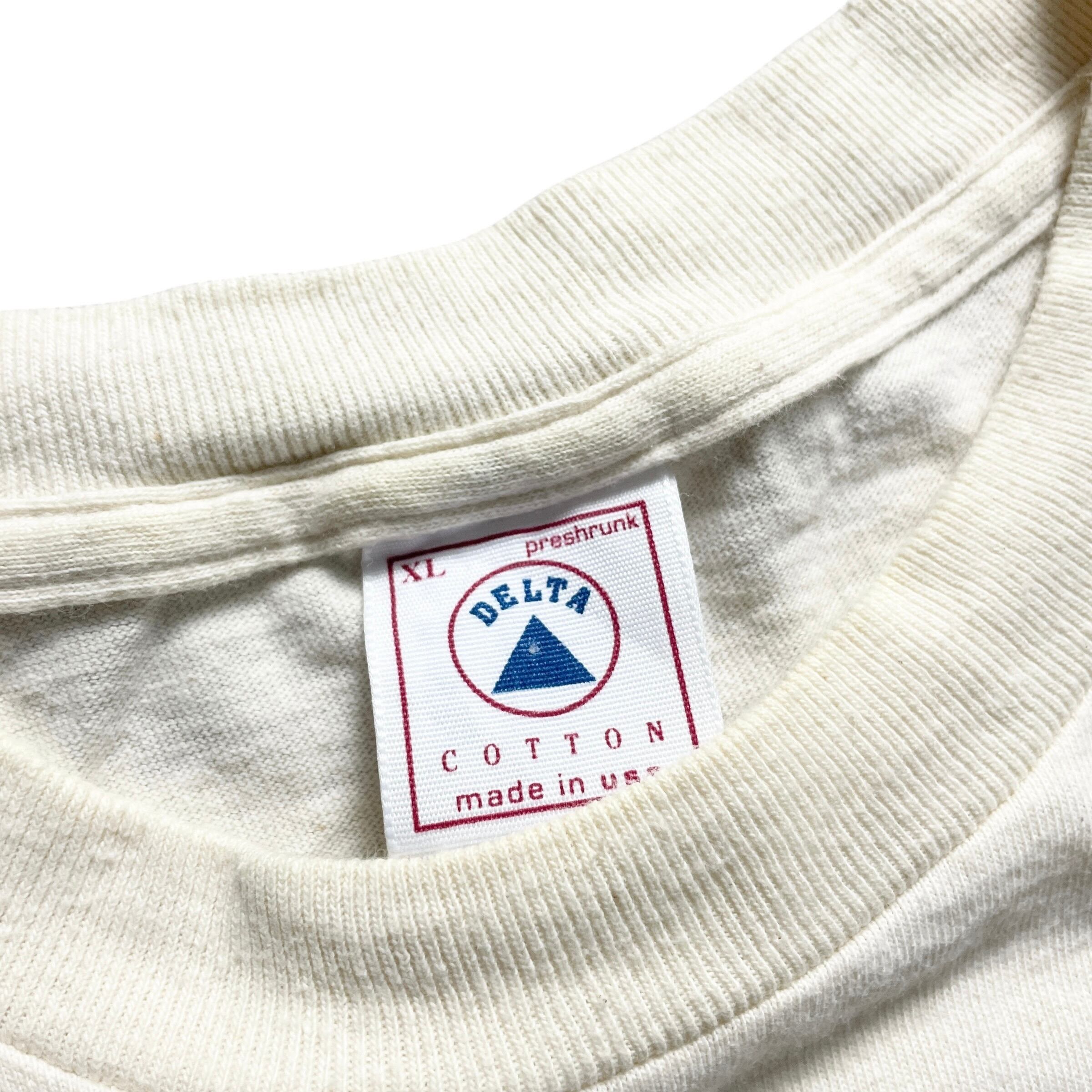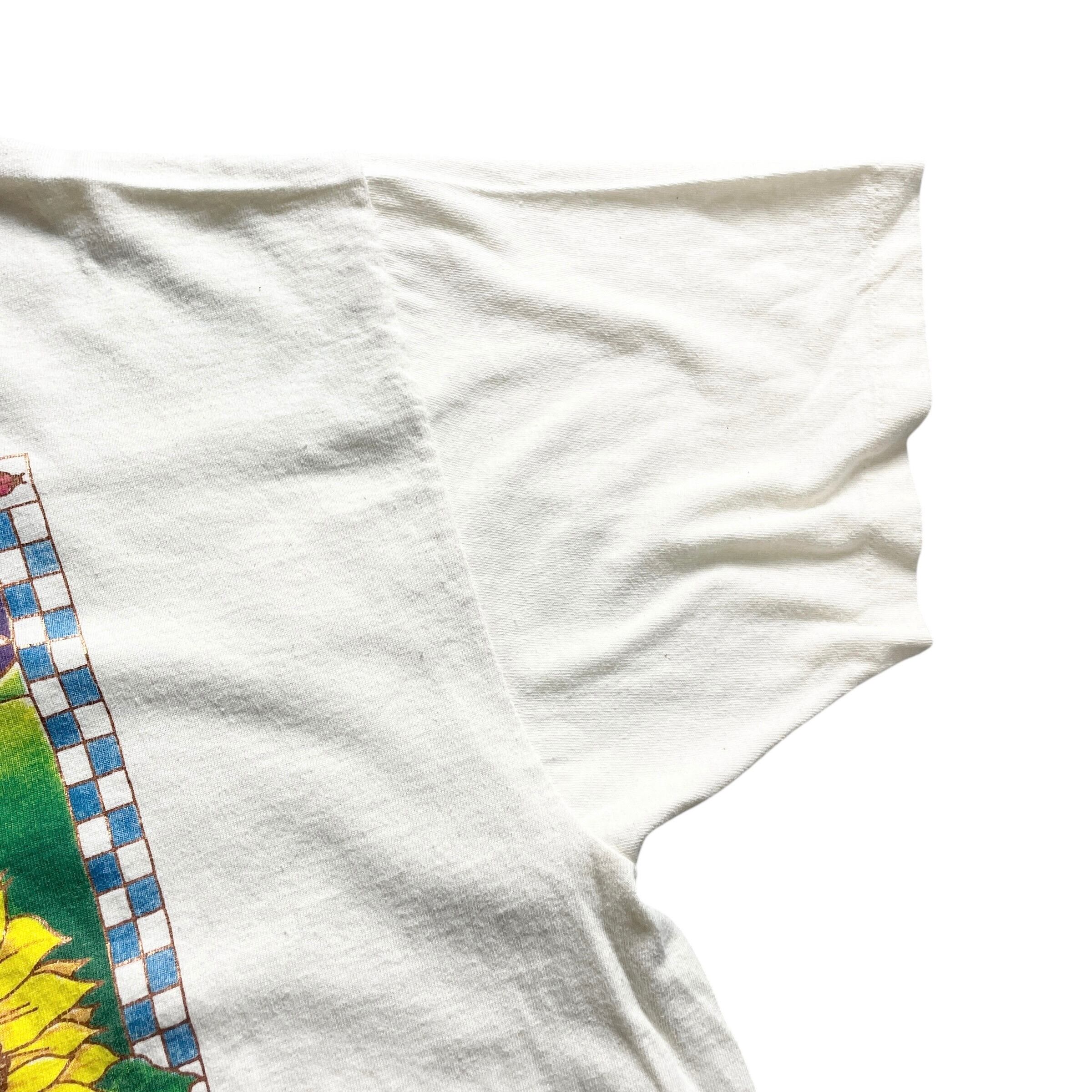 クラシカルな種袋のデザインをモチーフにした、鮮やかなサンフラワープリントが目を引く一枚。チェック柄のフレームに「Colorado」の文字が入り、アメリカの田舎町の風景を思わせる素朴で味わい深い雰囲気。色褪せやプリントのひび割れもヴィンテージならではの表情として楽しめます。やや生成りがかったボディに、90sらしい大判プリント。サロペットやデニムと合わせたアメカジスタイルにハマるおすすめの一枚です。