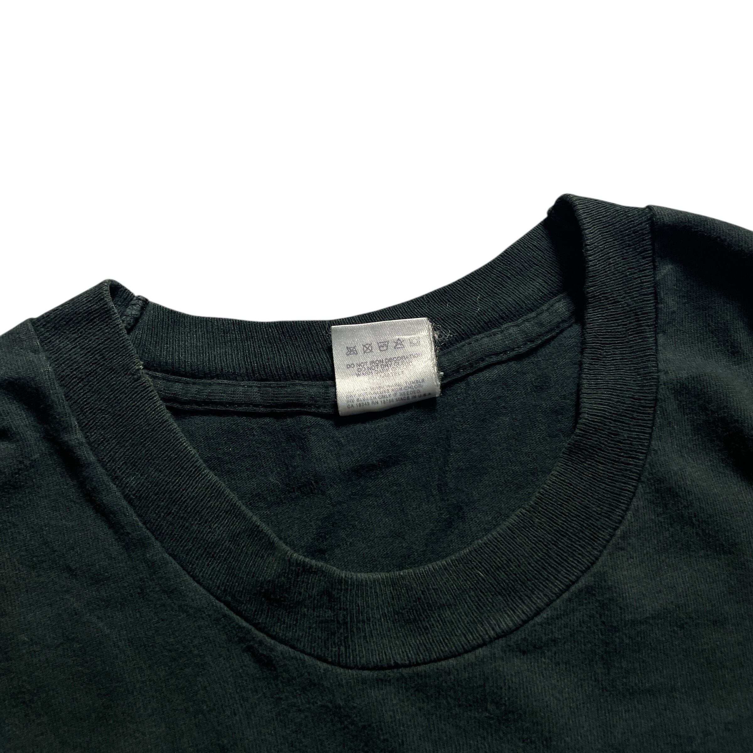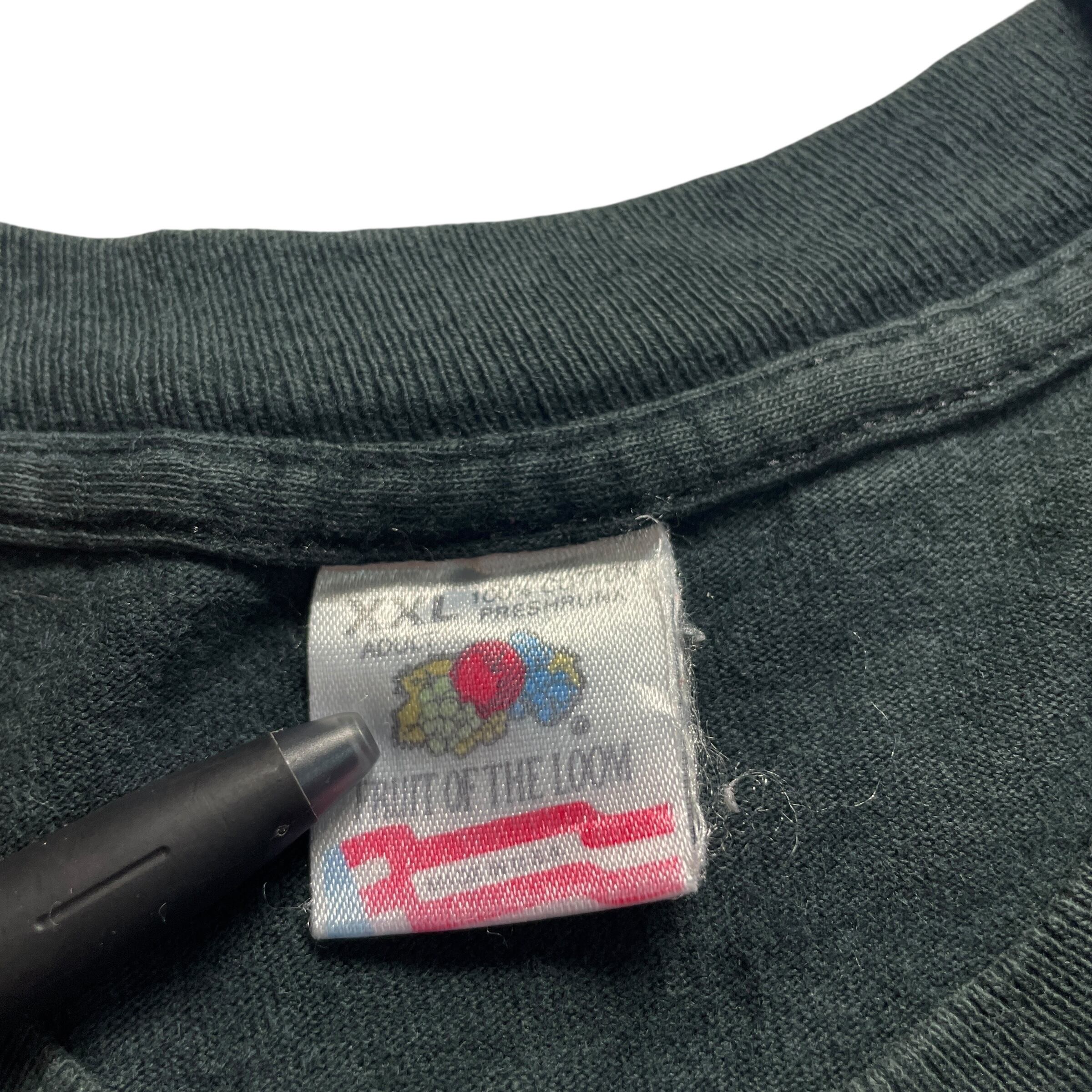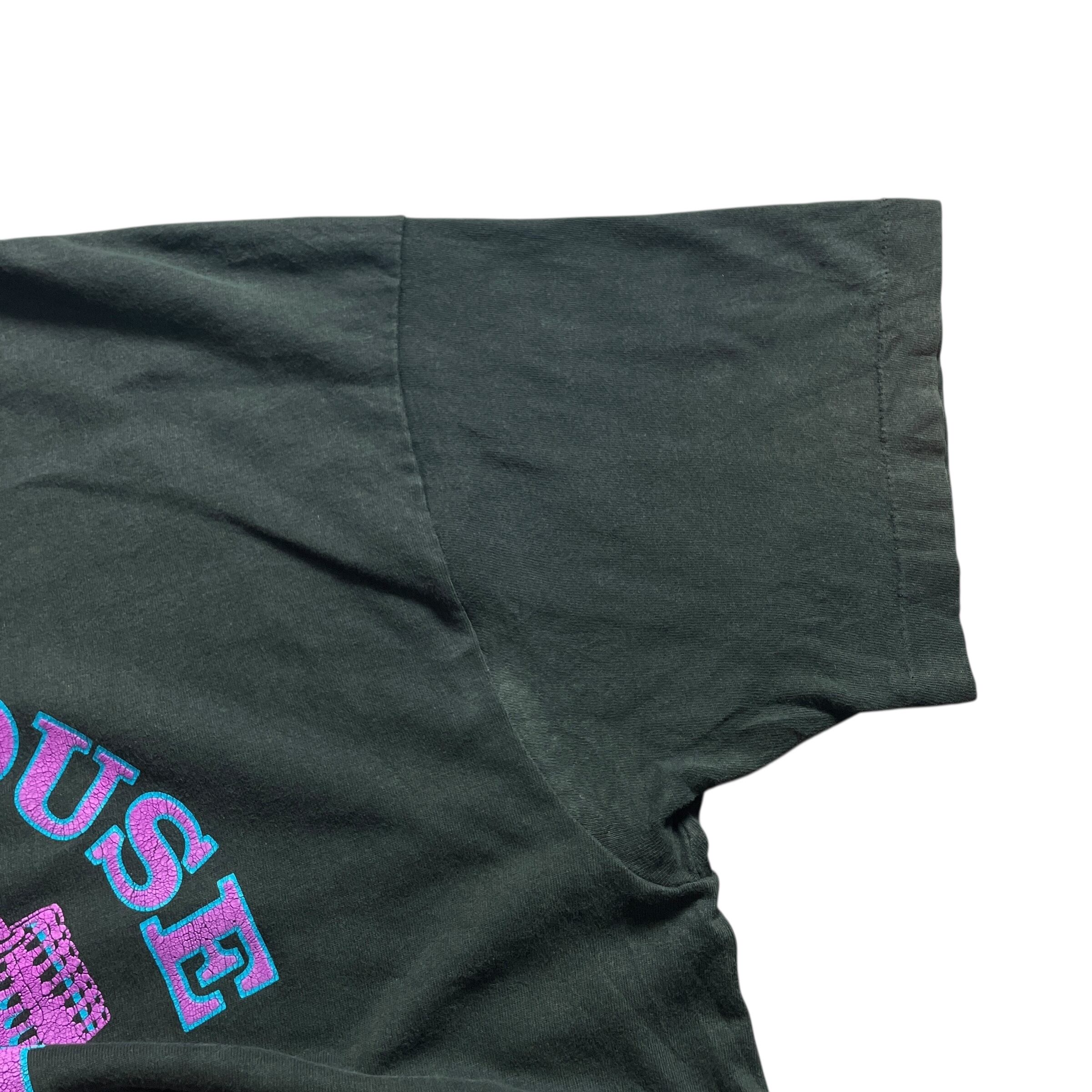 ボディビル好きならおなじみ、POWERHOUSE GYMのローカル版・Schaumburg(イリノイ州)支店プリント。ブラックボディにネオンピンク&ブルーのグラフィックが映える、アメリカのフィットネスカルチャーを象徴するようなデザインです。2000年代前後のTシャツに多く見られる、蛍光プリントの色褪せ具合が古着らしい良い雰囲気。ジムユースにも、ストリートミックスにもハマる万能ピース。