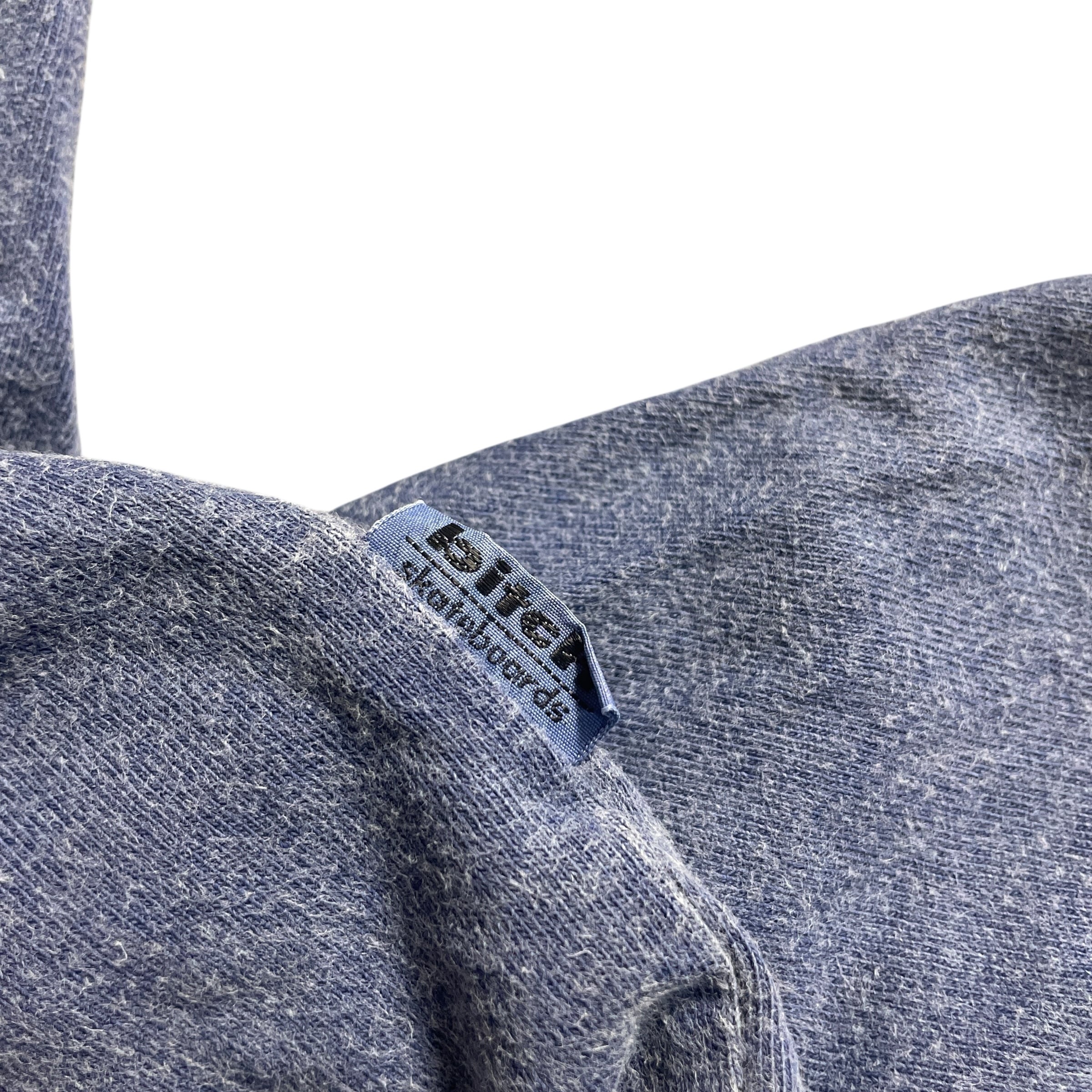 90sストリートを象徴するようなインディペンデントブランド「bitch」のVネックTee。くすみブルーに赤のラインが効いた配色センス、袖から裾までのルーズなシルエットは、まさに当時の空気感をそのまま纏った一枚です。胸元には小さく“b”の刺繍ロゴが入る控えめながらも芯のある主張。ややフェイクスエード調の質感も相まって、90sのアンダーグラウンドカルチャーや裏原の影響を感じさせる仕上がり。古着好きなら思わず「おっ」と声が出る渋さ、残ってたらラッキーなやつです。
