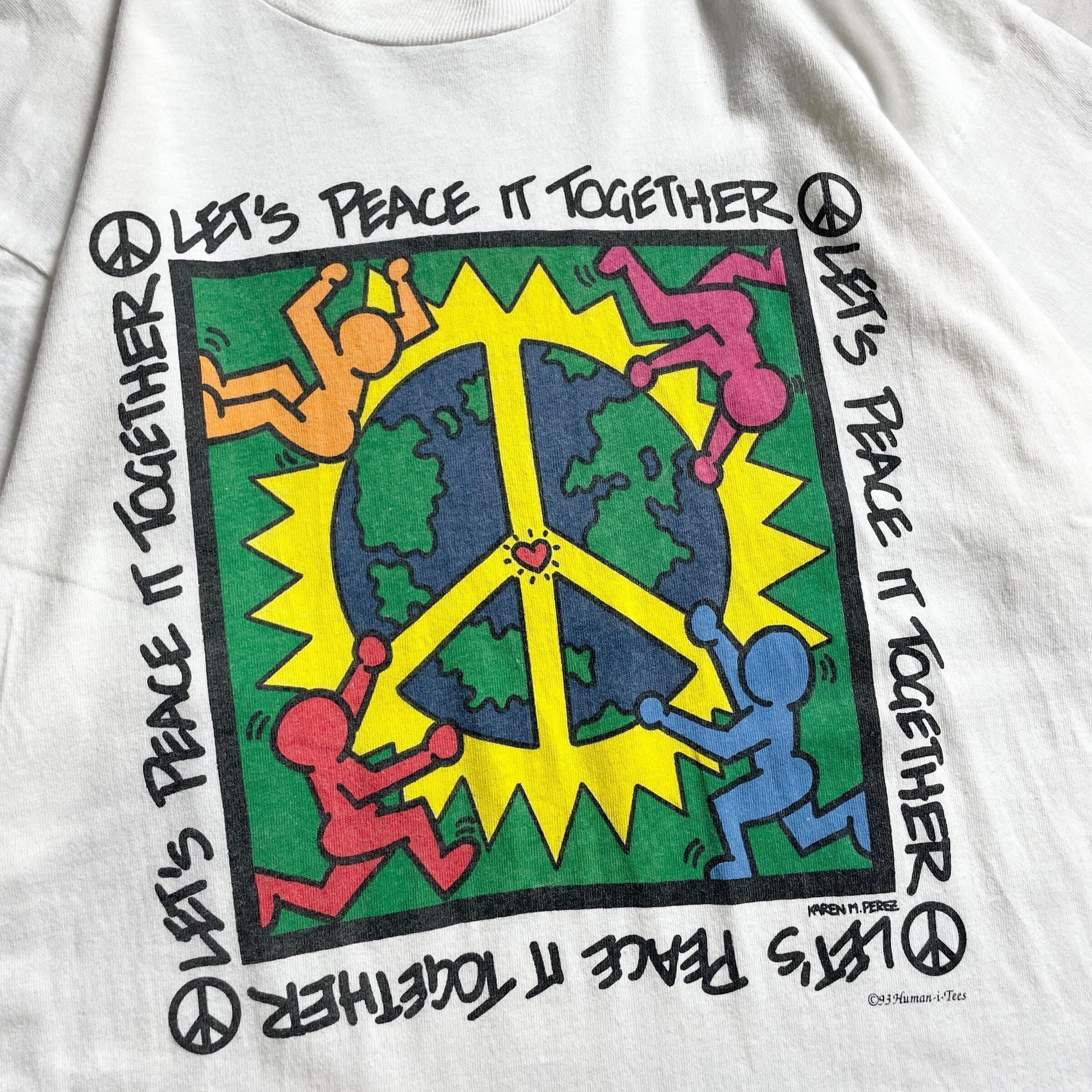 カラフルなキャラクターたちがピースマークを囲む、平和への願いをポップに表現したグラフィックTシャツ。まるでキース・ヘリングを思わせるポップアート風のデザインに、“Let’s Peace it Together”のメッセージが全体を包み込みます。90sカルチャーやメッセージT好きにはドンピシャな一枚。古着ならではのクタっとしたボディも味になっています。