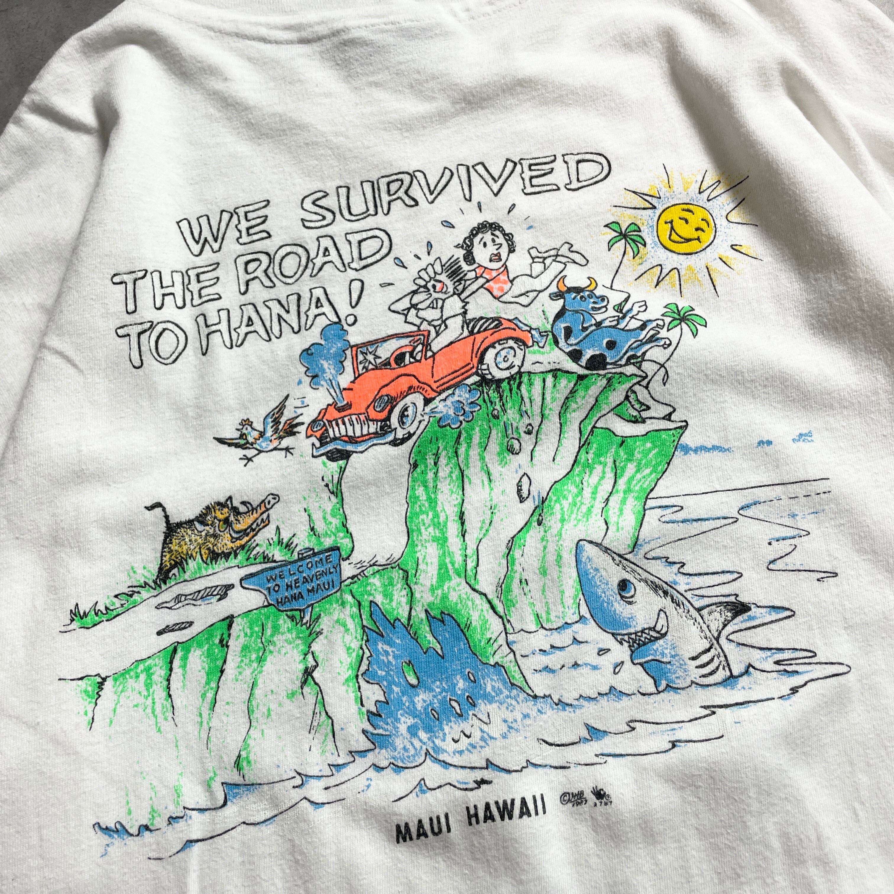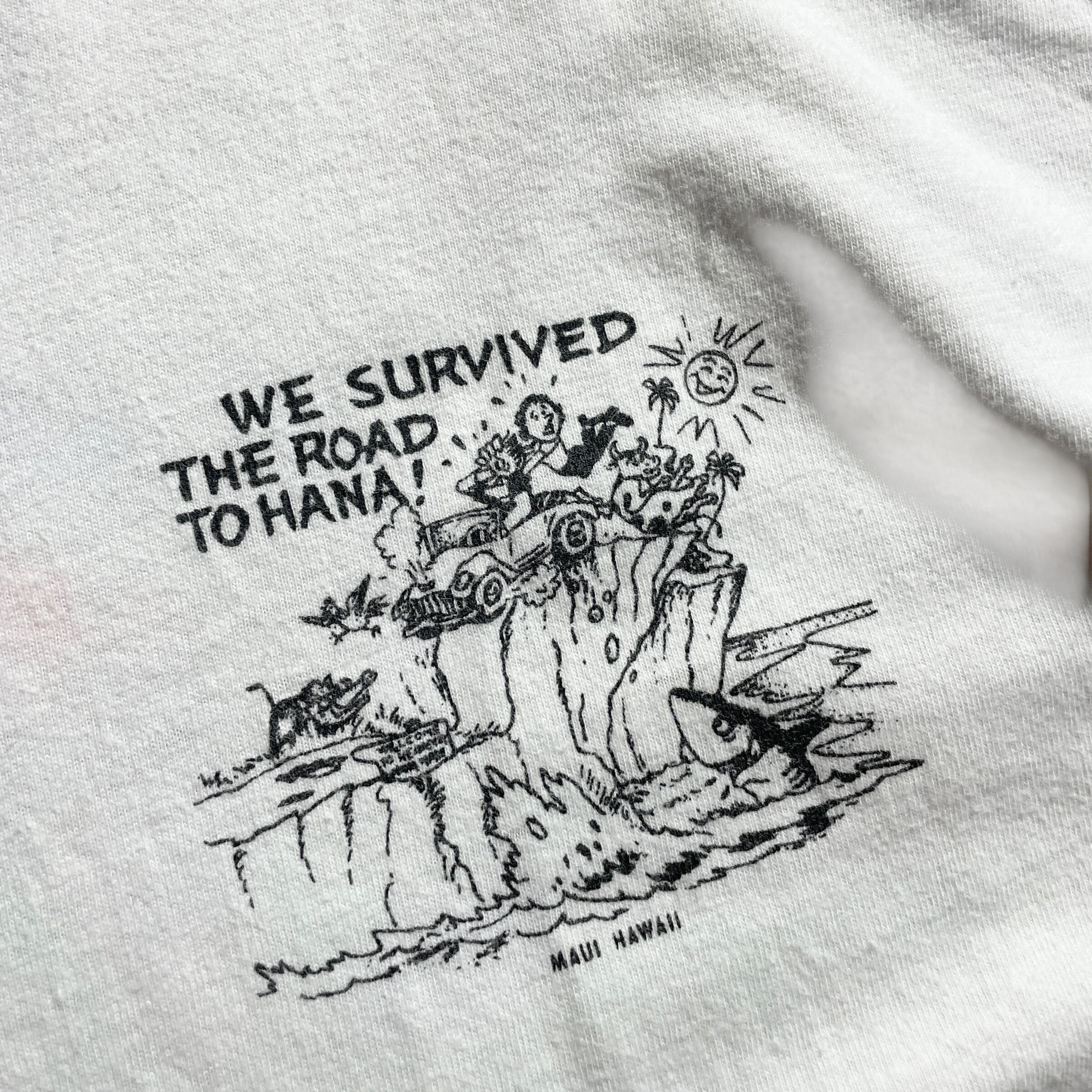 ハワイ・マウイ島の名物、曲がりくねった絶景ドライブルート“Road to Hana”を乗り越えた証として配られていた、お土産系Tシャツの傑作。荒ぶる海、崖っぷちの車、迫り来るサメやイノシシなど、誇張されたデザインがツボすぎます。観光Tの中でも特にパンチの効いた一枚。旅好きやローカルTコレクターにはたまらないユニークアイテムです。