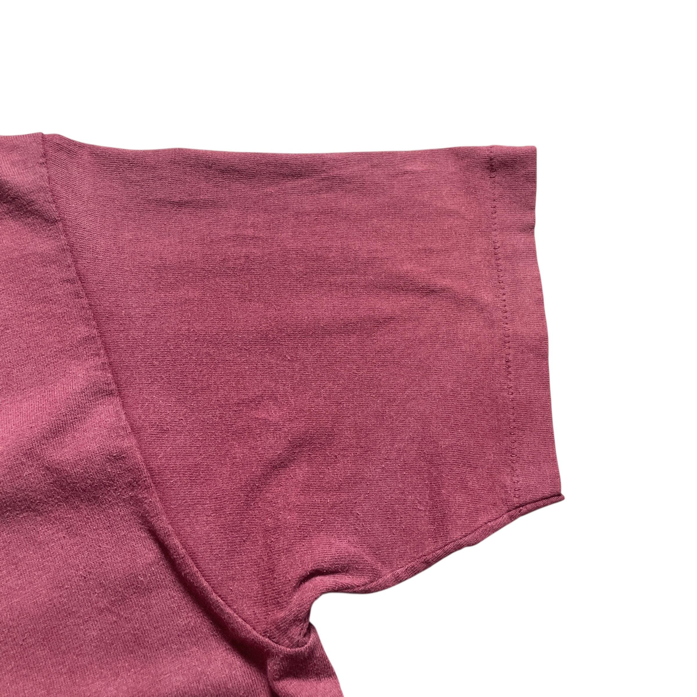 深みのあるバーガンディボディに、イエローのブロックロゴで大胆に「MINNESOTA」とプリントされた、王道のカレッジTシャツ。ボディは80年代頃のChampion製、しかも嬉しいUSA製タグ付き。肉厚で着応えのあるコットンボディは、洗い込むほどに風合いが増していく逸品です。ヴィンテージ ビンテージ tシャツ シングルステッチ