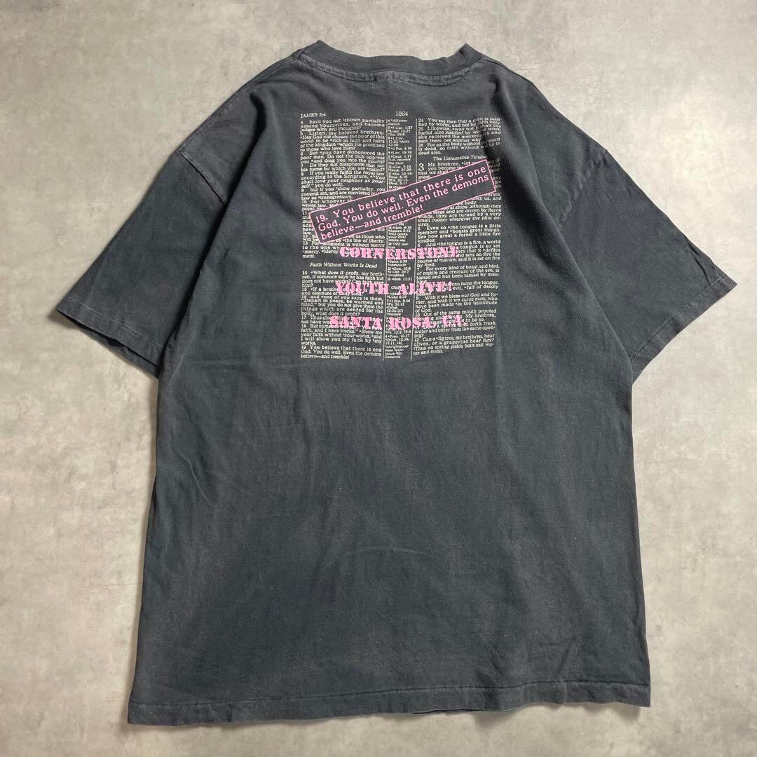 このTシャツはカリフォルニア州サンタローザの「CORNERSTONE YOUTH ALIVE」という若者向けのキリスト教系イベントやキャンプの一幕で制作されたと思われ、まさに90年代の“信仰×反骨”カルチャーを象徴する1枚。