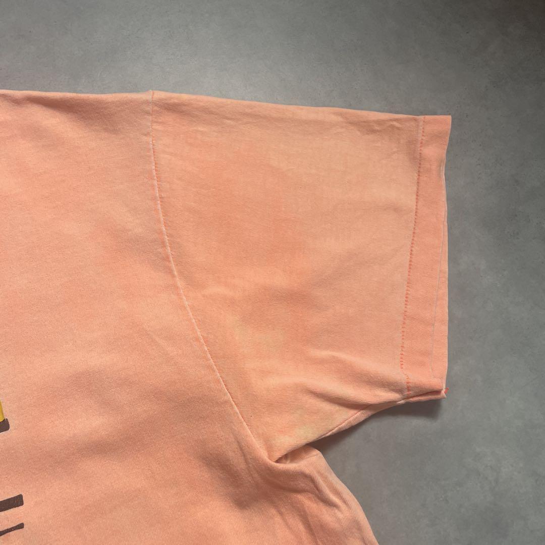 1991年、ニューヨーク・セントラルパークで開催された「SHAKESPEARE FOR EVERYONE(シェイクスピアをすべての人へ)」イベントTシャツ。スペイン語「SHAKESPEARE PARA TODOS」とも併記されており、ニューヨークの多文化性と開かれたアートの精神を感じさせます。ピンクオレンジの優しいボディカラーも秀逸で、まるで詩の一節のような美しさ。NYCローカルイベントものとしても貴重な存在で、90年代初期の文化的空気をまとう一枚です。ヴィンテージ ビンテージ tシャツ シングルステッチ