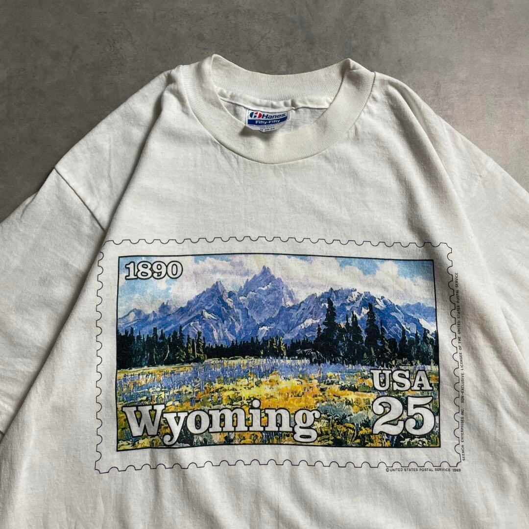 ワイオミング州の風景が美しく描かれた、アメリカ郵政公社(USPS)発行の25セント切手デザインをそのままプリントした一枚。1890年の州昇格を祝う歴史的なモチーフで、ワイオミング州の自然豊かな風景が色鮮やかに表現されています。1990年製のコピーライト入りで、当時のUSPSプロモグッズとしても貴重な存在。ネイチャーやアウトドア、アメリカのローカルカルチャー好きに刺さる一着です。ヴィンテージ ビンテージ tシャツ シングルステッチ