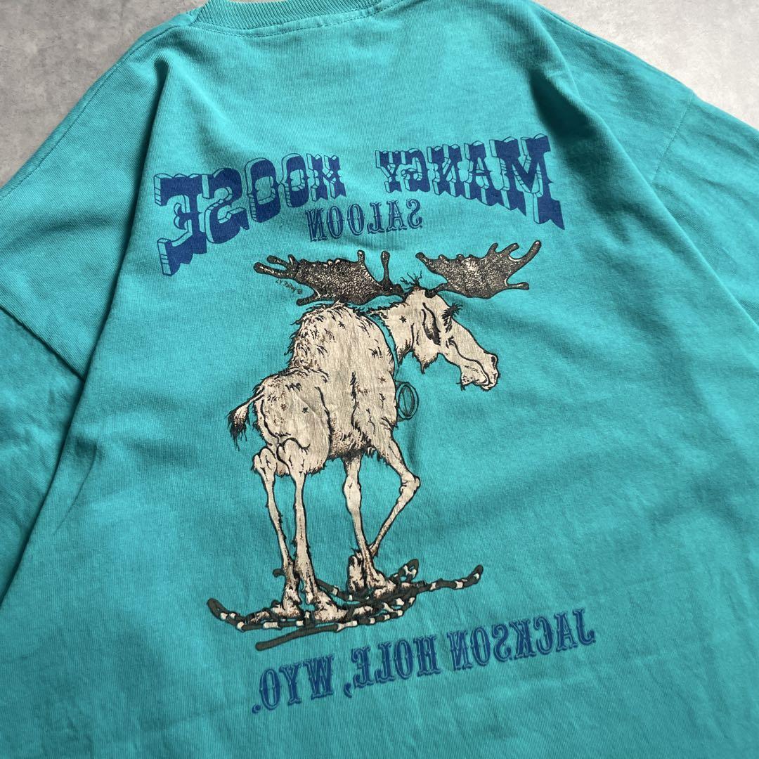 アメリカ・ワイオミング州ジャクソンホールに実在する老舗バー「Mangy Moose Saloon」のお土産Tシャツ。やせ細ったムース(ヘラジカ)がスノーシューを履いてるユニークなイラストに、ウエスタン調のフォント。ターコイズブルーのボディもアメリカンローカルな空気を纏い、旅の香りを感じる一枚です。