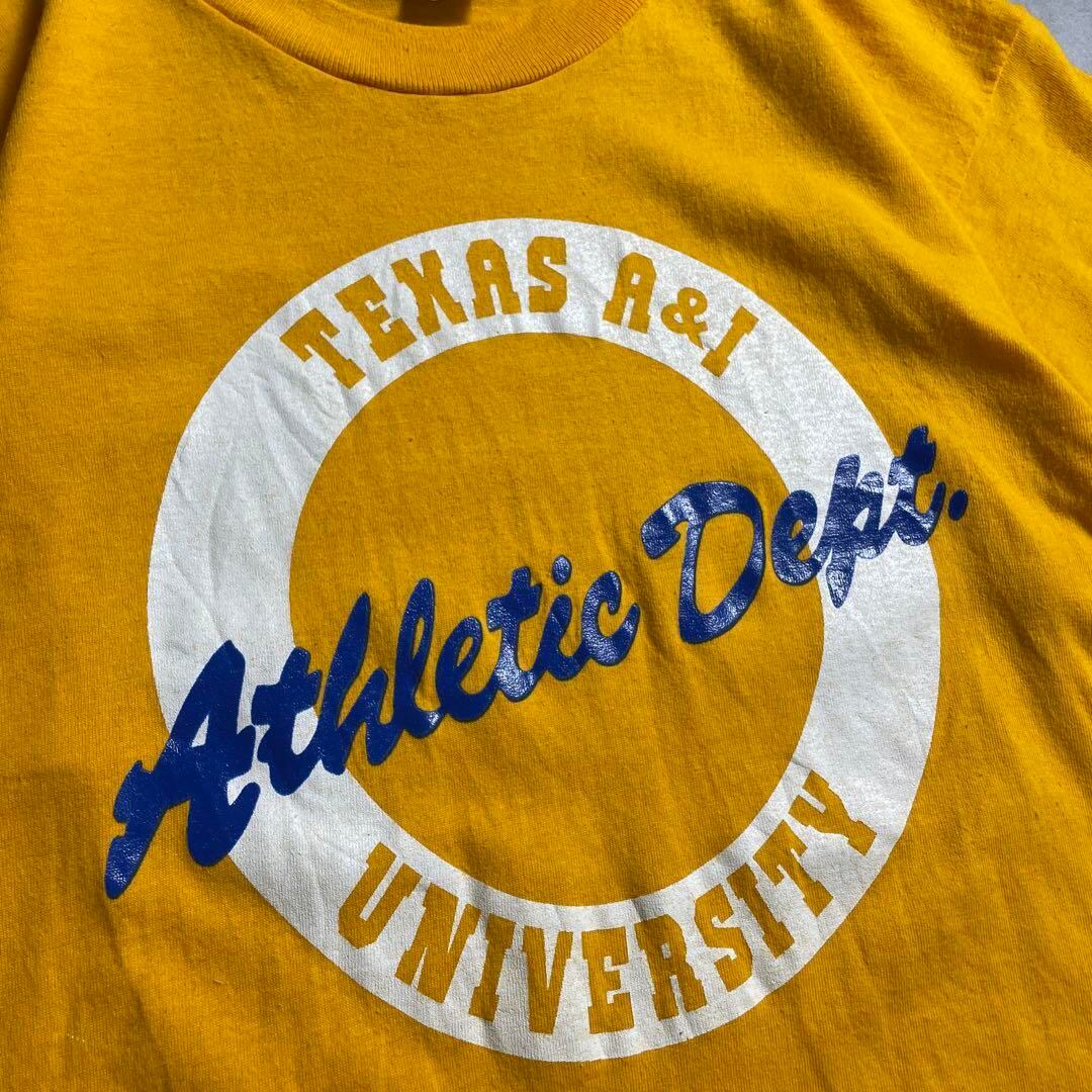 現在はTexas A&M-Kingsvilleとして知られるテキサス南部の大学、Texas A&I UniversityのヴィンテージTシャツ。鮮やかなイエローボディにホワイト×ブルーのレトロカレッジプリントが映えます。70s〜80sの古着ならではの柔らかいコットンの風合いと、絶妙なフェード感が魅力。スポーツ系カレッジTシャツ好きにはたまらない一枚です。