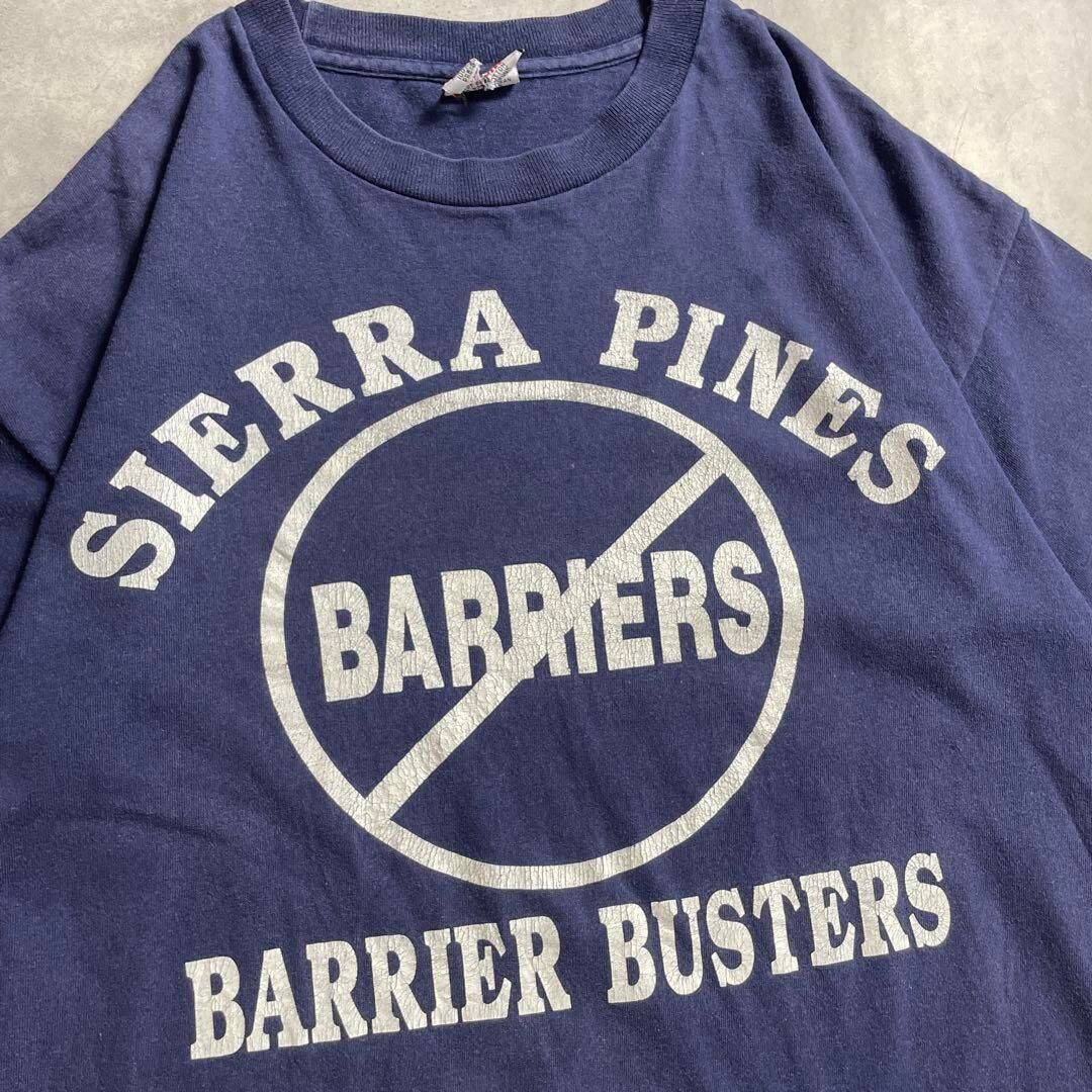 “BARRIERS”に斜線が引かれた力強いロゴが印象的なこちらは、おそらく地域支援や教育関連のスローガンTシャツ。“BARRIER BUSTERS”というコピーには「壁を打ち破る人々」のメッセージが込められ、コミュニティの結束や支援の姿勢を感じさせます。濃紺のボディにホワイトプリントが潔く、着るだけで前向きなパワーをもらえる一着。ヴィンテージ ビンテージ tシャツ シングルステッチ
