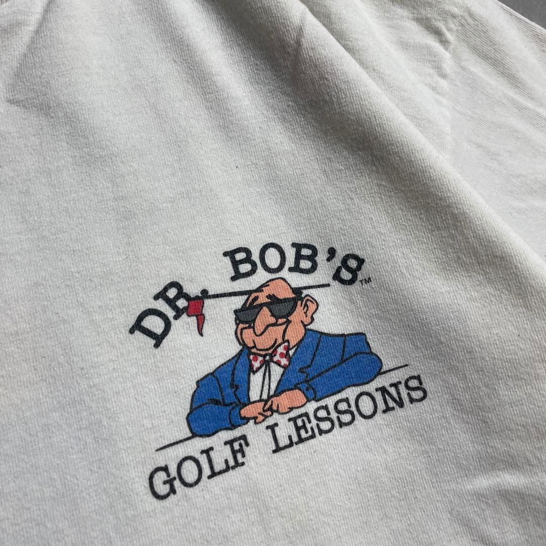 ゴルフに情熱を燃やすおじさんたち必見のジョークTシャツ。「怒りを鎮めたその瞬間、またゴルフに戻る」と語る“GOLF LESSON #75”。サングラスに蝶ネクタイのキャラクターと、太めのコミック調フォントがどこか新聞の四コマ漫画を思わせるデザイン。1999年のコピーライト入り、白ボディ×レトロなカラーバランスも最高です。スポーツ好きはもちろん、洒落っ気のあるヴィンテージを探している方にもおすすめ。ヴィンテージ ビンテージ tシャツ シングルステッチ