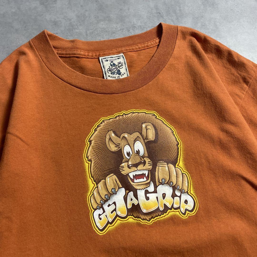 どこか懐かしくて愛嬌のあるライオンが爪を立てるように飛び出した、「GET A GRIP」の文字と共に描かれたコミカルT。濃いめのオレンジボディに、黄色いアウトラインと立体的なグラフィックがポップに映えます。Made in USAタグ付き、アメリカ製ならではのコットンの質感も◎。ストリートにも古着コーデにもハマる、クセになる存在感の一枚。ヴィンテージ ビンテージ tシャツ シングルステッチ