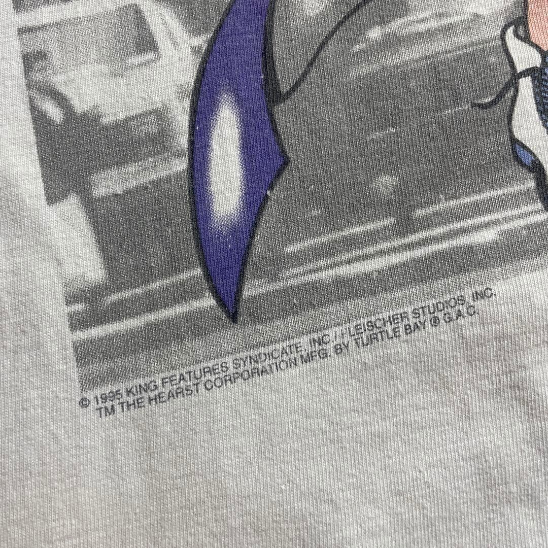大胆な街並みに立つ、どこか照れたようなベティ・ブープが主役の一枚。背景にはニューヨークの摩天楼、足元はスニーカー、アウターはパープルのトレンチ。そんな90s〜00sらしいストリート感と遊び心が詰まったグラフィックTシャツです。大きく配置された“BBNY”と“NYC”の文字がアクセントになっており、アニメTながらも都会的なムード。ボディはやや生成り寄りのホワイト。グラフィックT好きにもストリート好きにもハマる、洒落の効いた一着です。ヴィンテージ ビンテージ tシャツ シングルステッチ