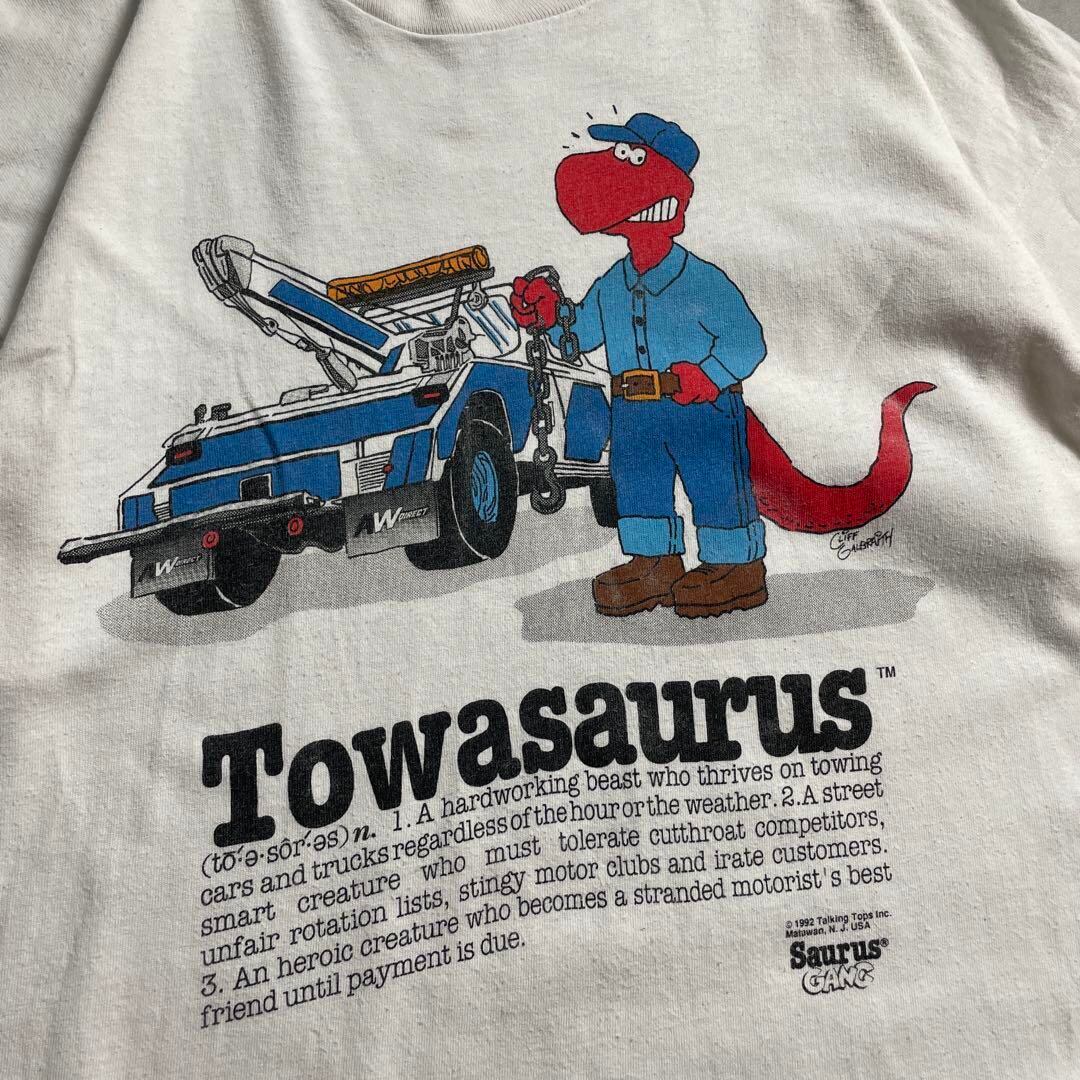 トラック整備員姿の恐竜キャラが目を惹く“Saurus Gang”シリーズの名作。“Towasaurus”(レッカーサウルス)という架空の定義付きで、ガッツあふれる働き者なキャラに仕上がってます。1993年製のコピーライト入りで、恐竜+職業ユーモアという90年代らしいカルチャーが詰まった一着。ツボる人にはド直球の一枚。