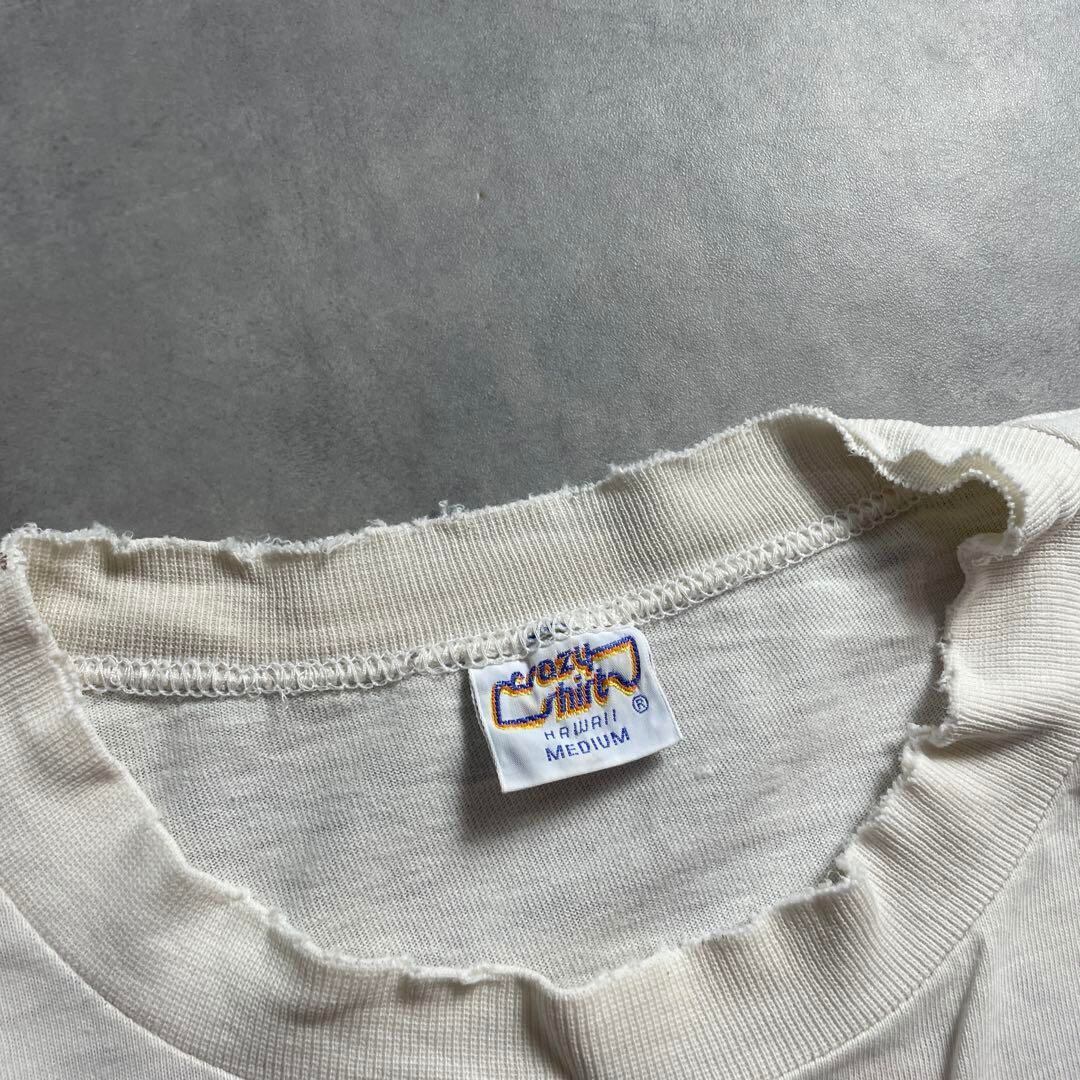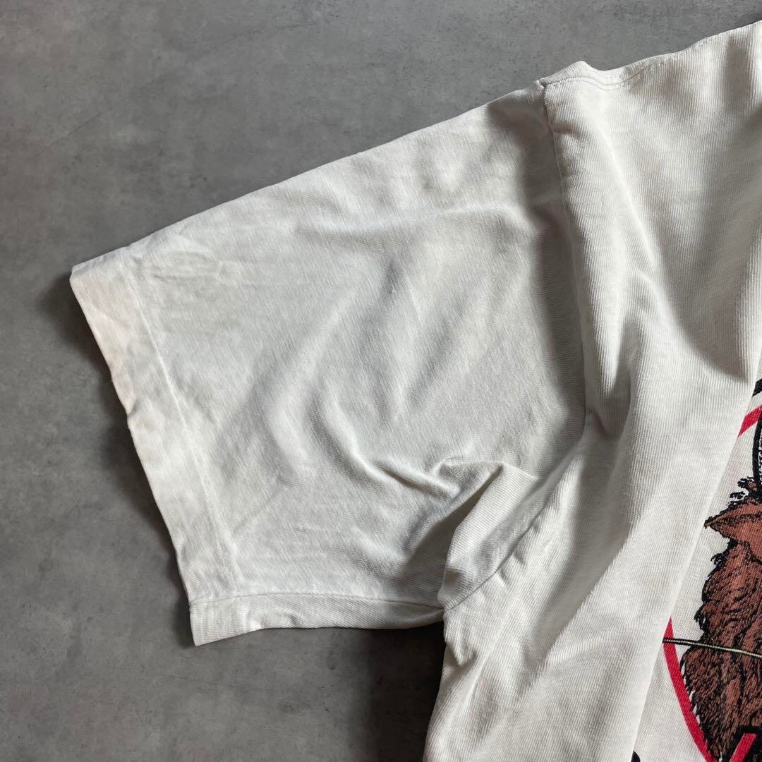 バッファローのどや顔が目を惹く、アメリカ西海岸カタリナ島発の「Buffalo Beer」プロモTシャツ。麦の茎をくわえたユルい表情と、「Great With Chips」のジョークが効いた一枚。架空のブリュワリー「The Vanishing Brewery」も洒落が効いていて、観光地の土産感が絶妙。クリームがかったオフホワイトボディもGOOD。ローカルビール好きやクラフトビールカルチャーが好きな方にもおすすめの、ツウ好みなヴィンテージです。ヴィンテージ ビンテージ tシャツ シングルステッチ