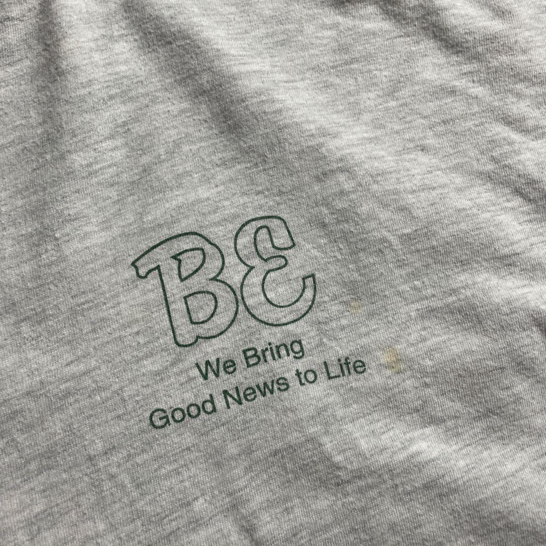 グレーボディに描かれた4コマ風のコミックには、天国での「神のパフォーマンス」が描かれたユーモアあふれる一枚。皿回し、ジャグリング、トランペット、そしてまさかの人間大砲まで!?観客はすべて天使たちというディテールも遊び心満載。キャッチーでシュールなアートに惹かれる方におすすめの、90sならではのジョークTです。
