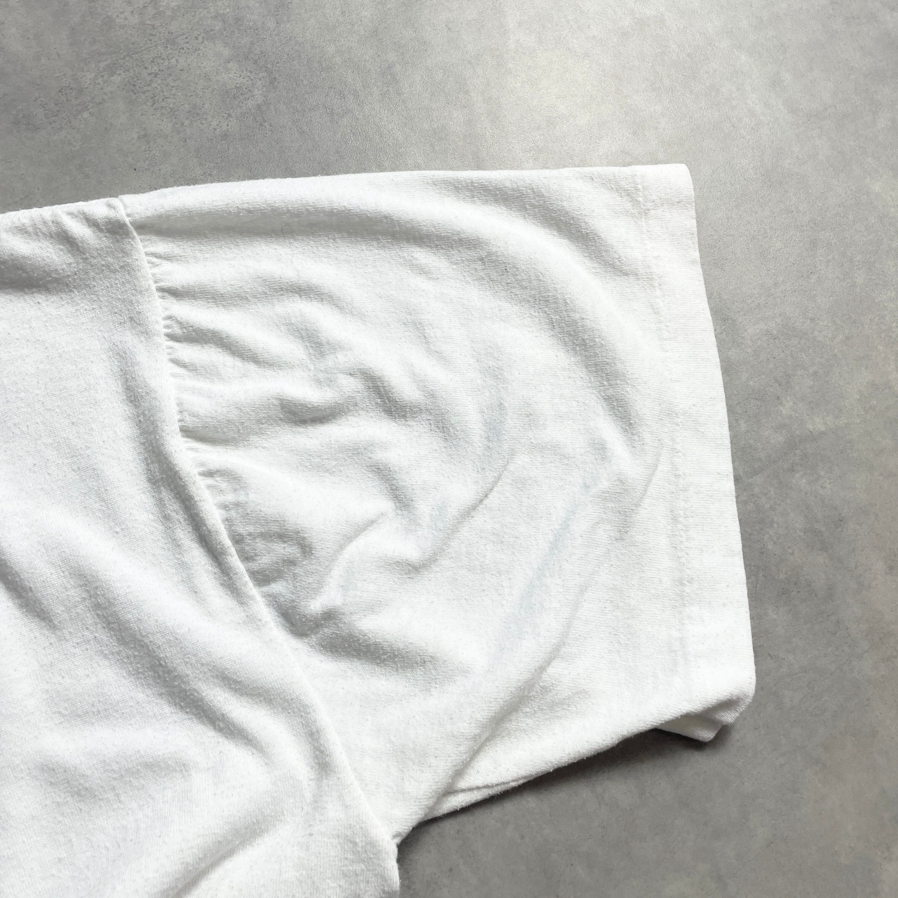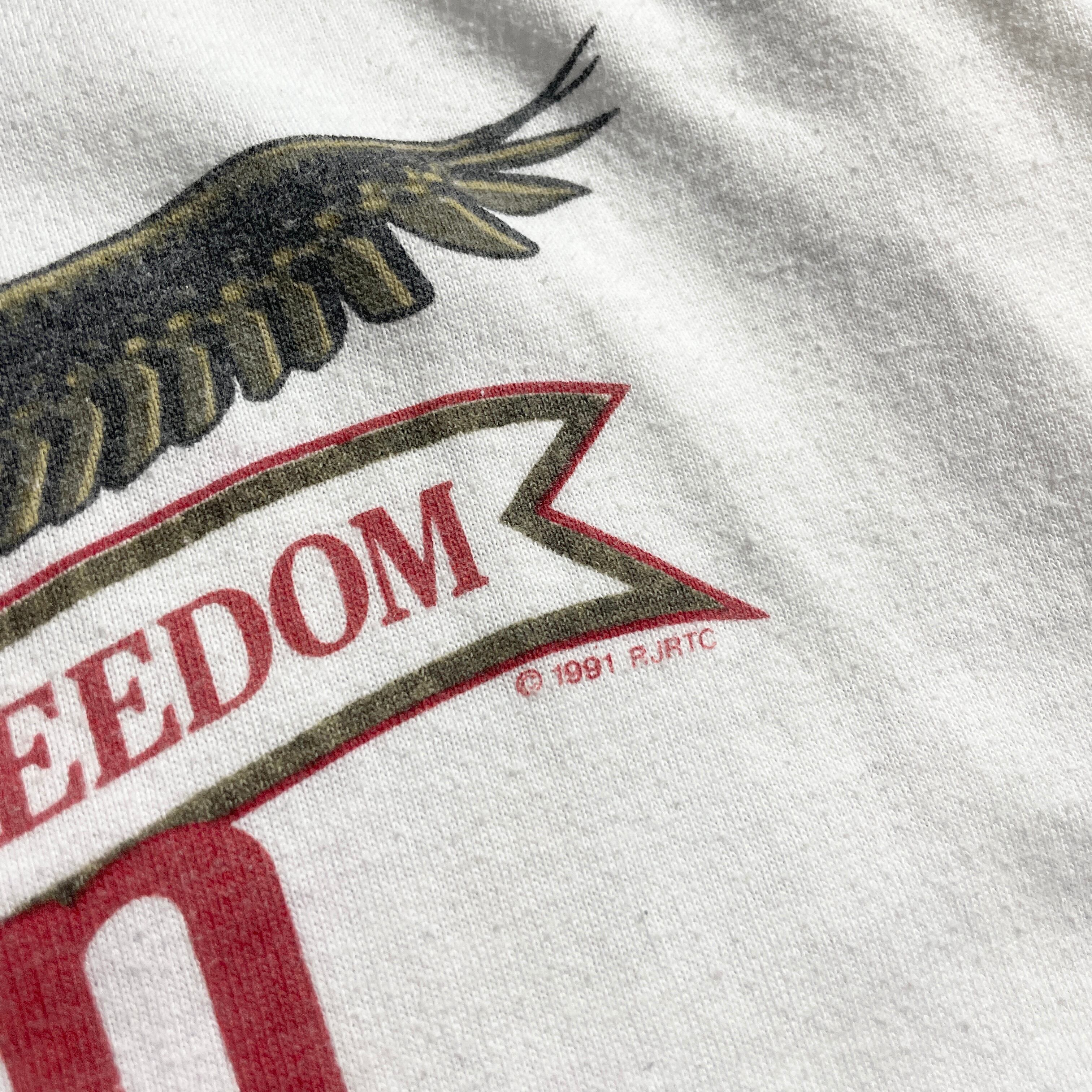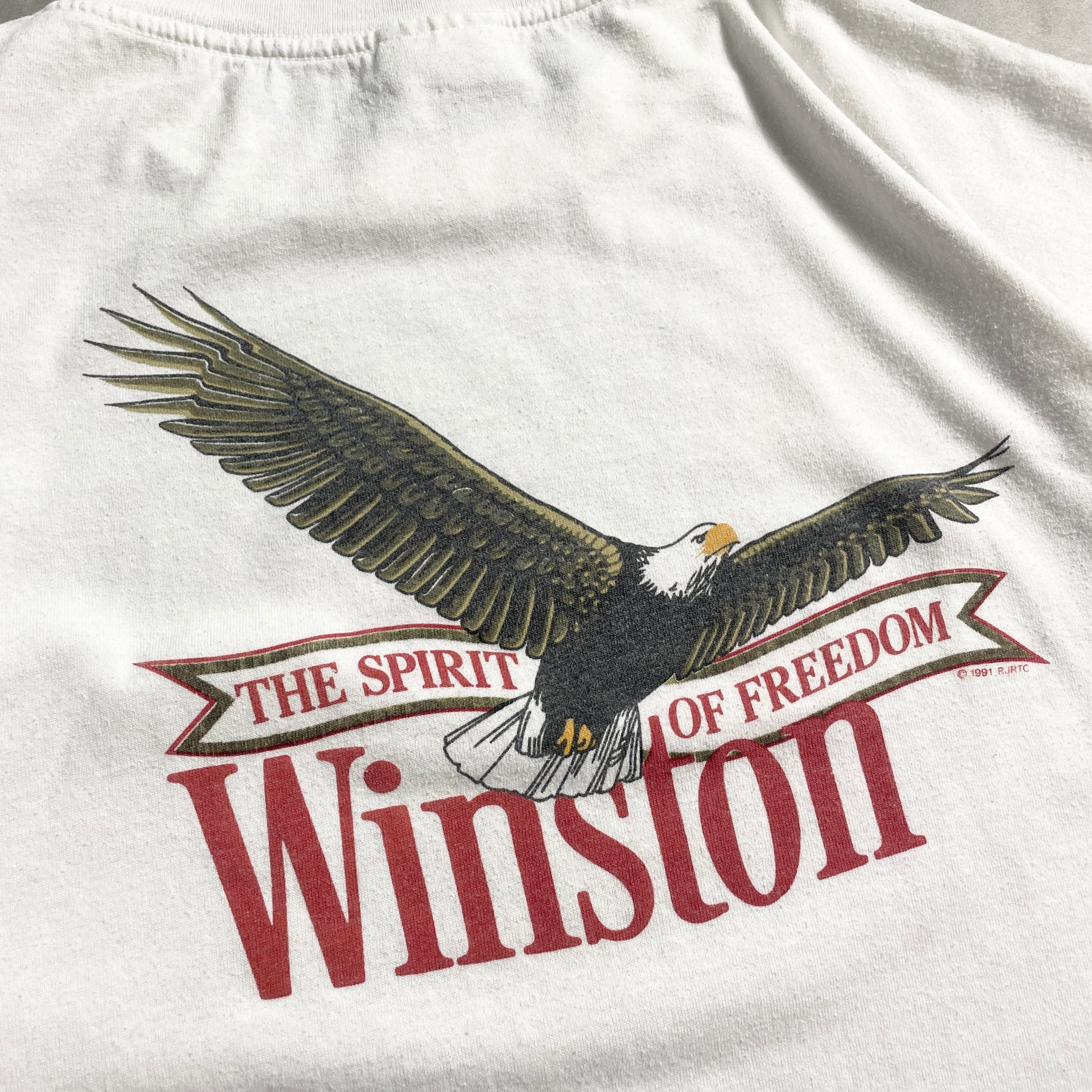 アメリカンヴィンテージ好き必見、Winstonシガレットの1991年製プリントTシャツ。大空を羽ばたくイーグルと”THE SPIRIT OF FREEDOM”の文字が映える、まさにアメリカン・スピリットを象徴するような一枚です。裏にしっかり1991年のコピーライト入り。白ボディにクラシックな赤と黒の配色で、バイカーやヴィンテージ好きにも根強い人気を誇るアイテム。ガツンとアメリカンなスタイルを楽しみたい日におすすめ。
