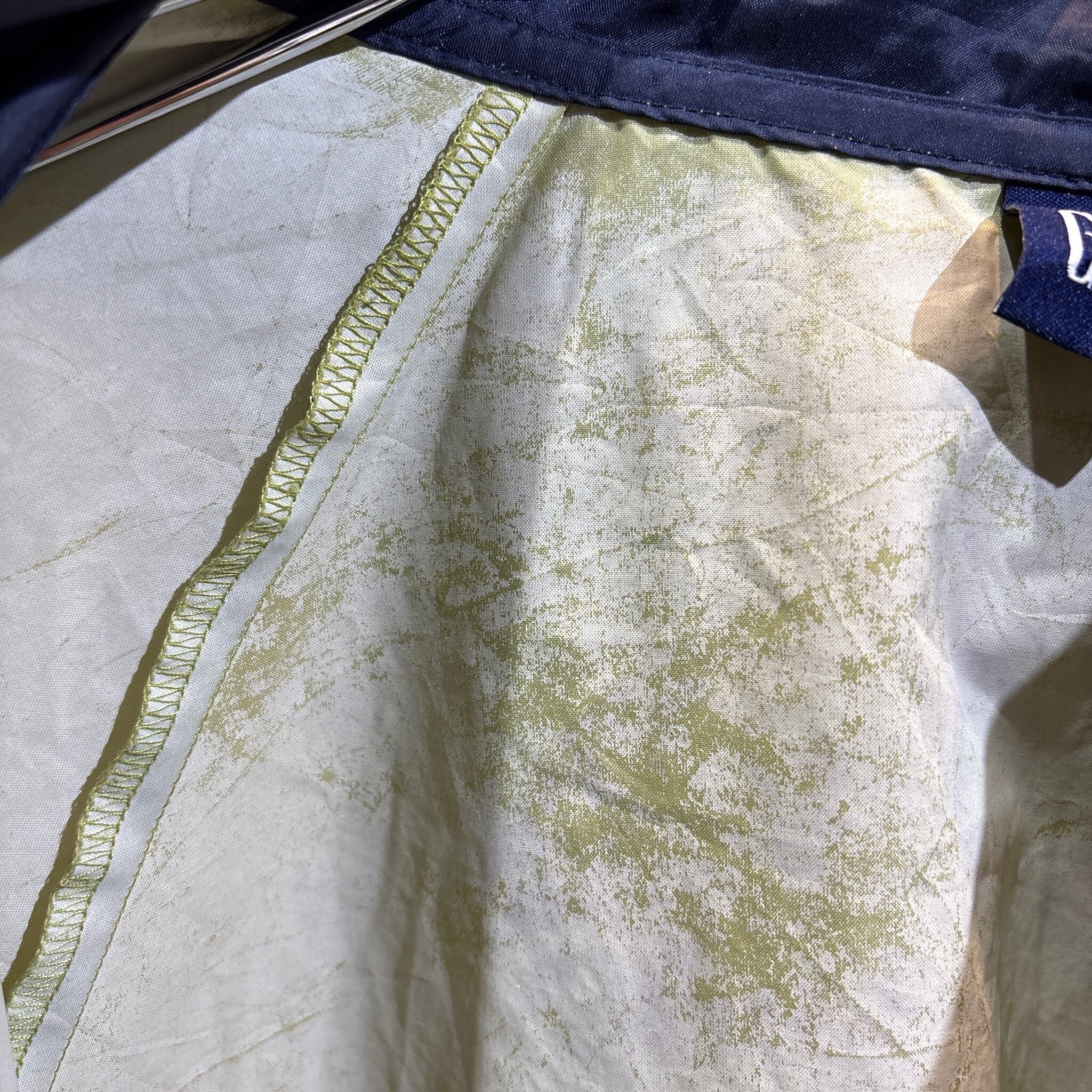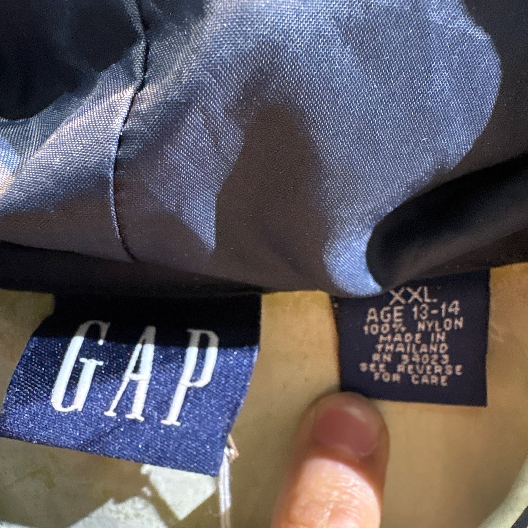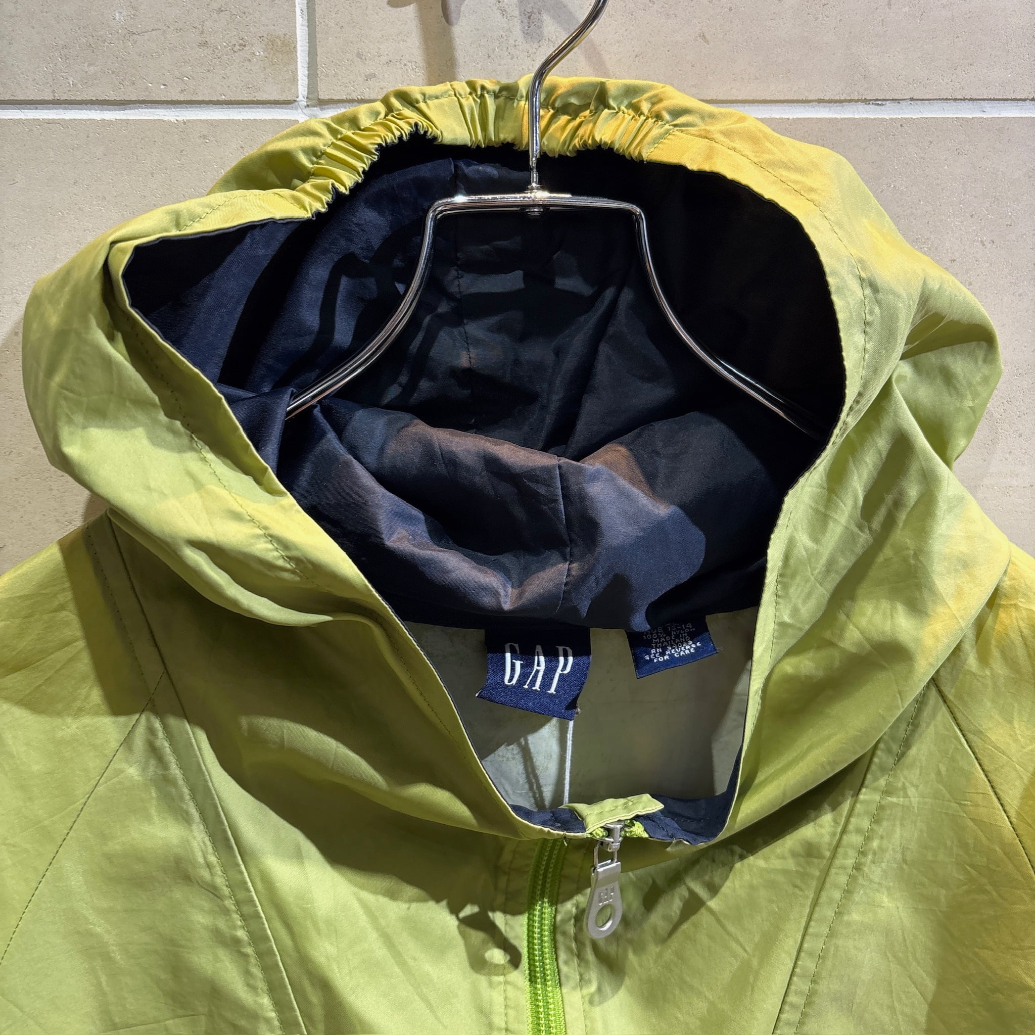 GAPのライムグリーンが目を惹くアノラックパーカー。ジップの配色や立体感あるフード構造が特徴。裏地付きで風を通しにくく、アウトドアムードにぴったり。キッズXXLだが大人のMくらいとしても着用可。