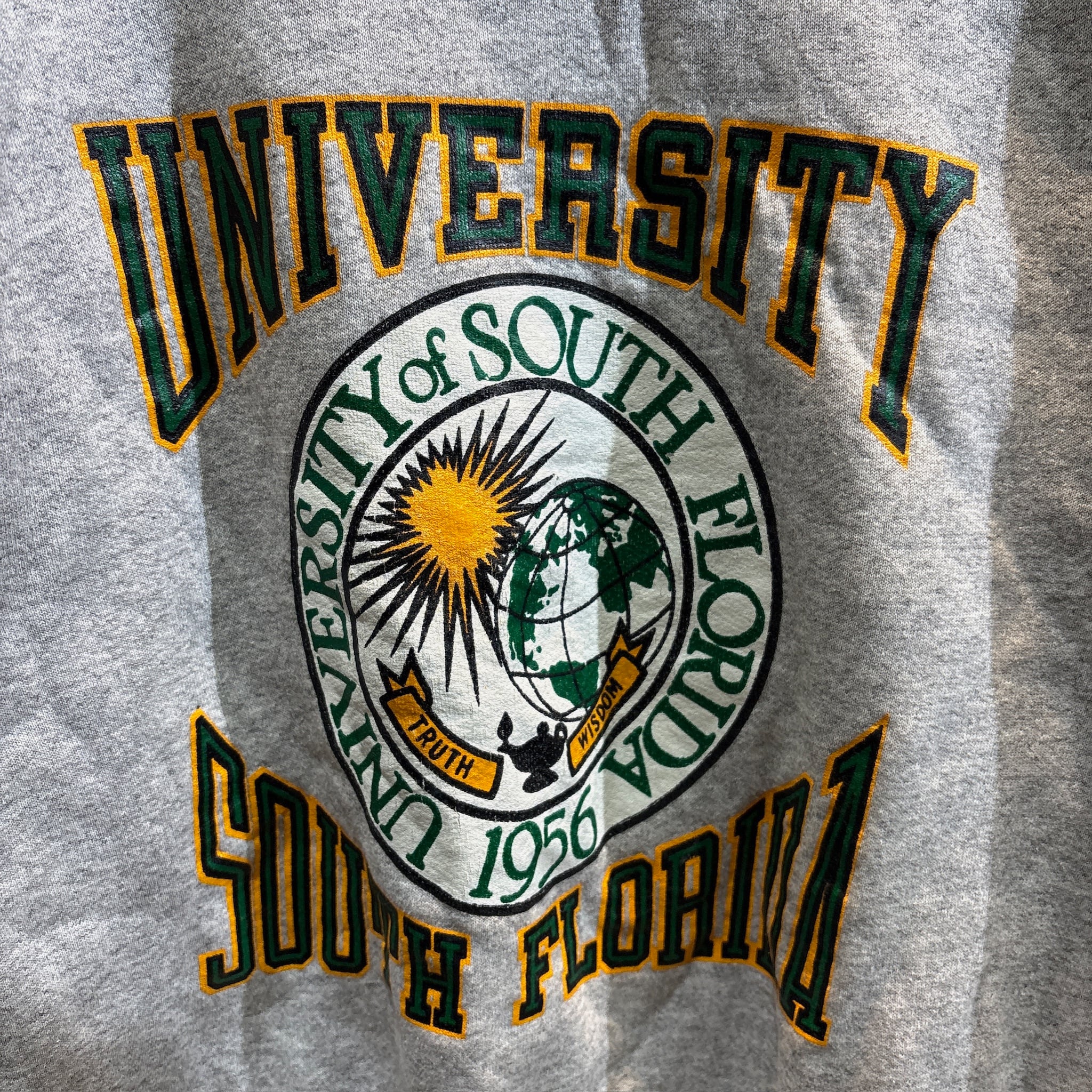1990年代ソフィー製、サウスフロリダ大学のプリントスウェット。アメリカ製で、グリーン×イエローの配色が目を引くデザイン。ゆったりとしたシルエットでカレッジスタイルにもおすすめです。