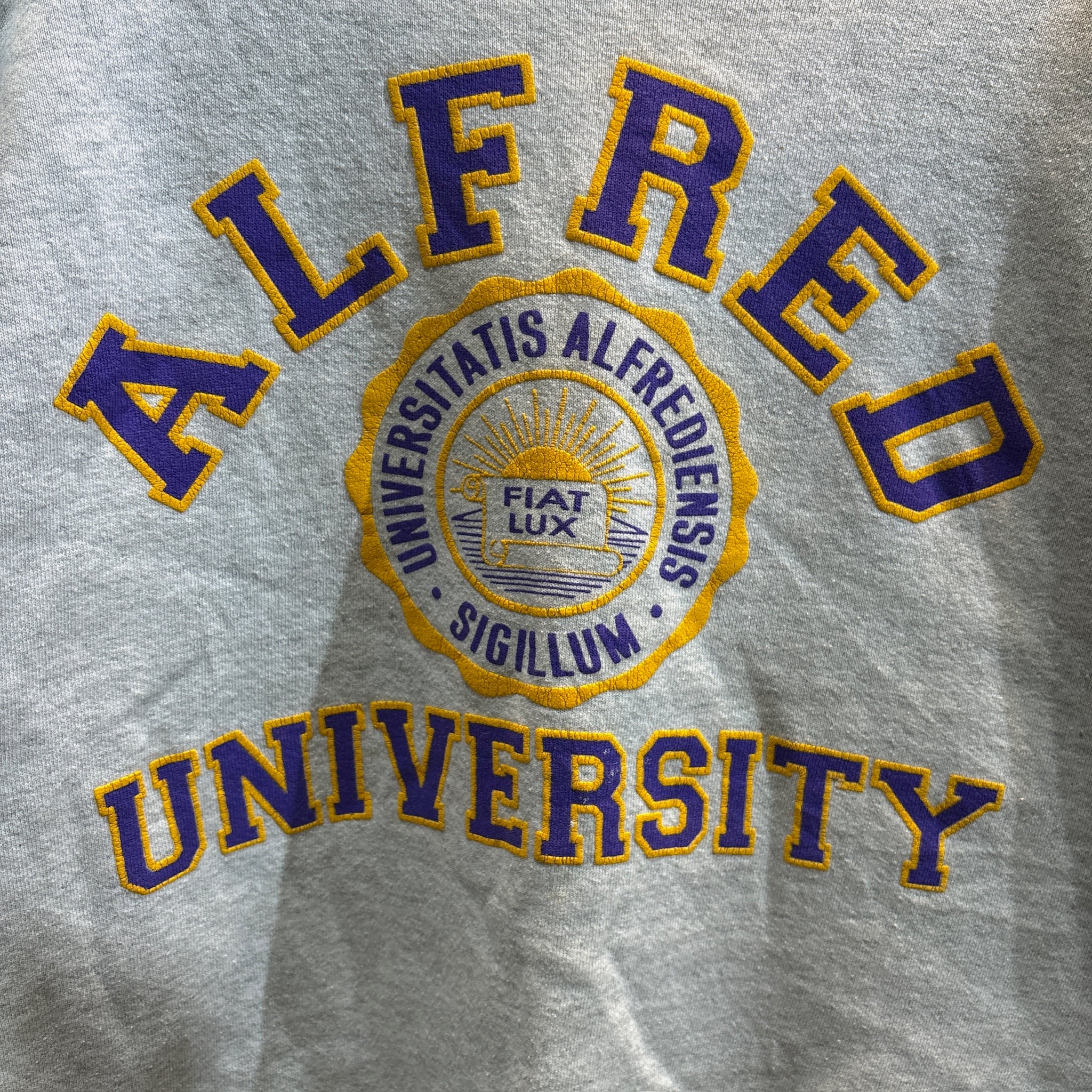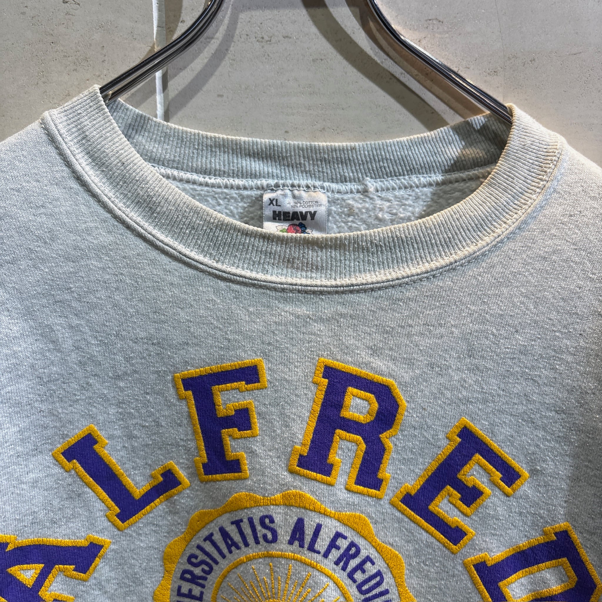 90年代フルーツオブザルーム製、アルフレッド大学のプリントスウェット。グレーのボディにイエローとパープルのカレッジロゴが映えるデザイン。アメリカ製・ヘビーウェイトでしっかりとした生地感です。