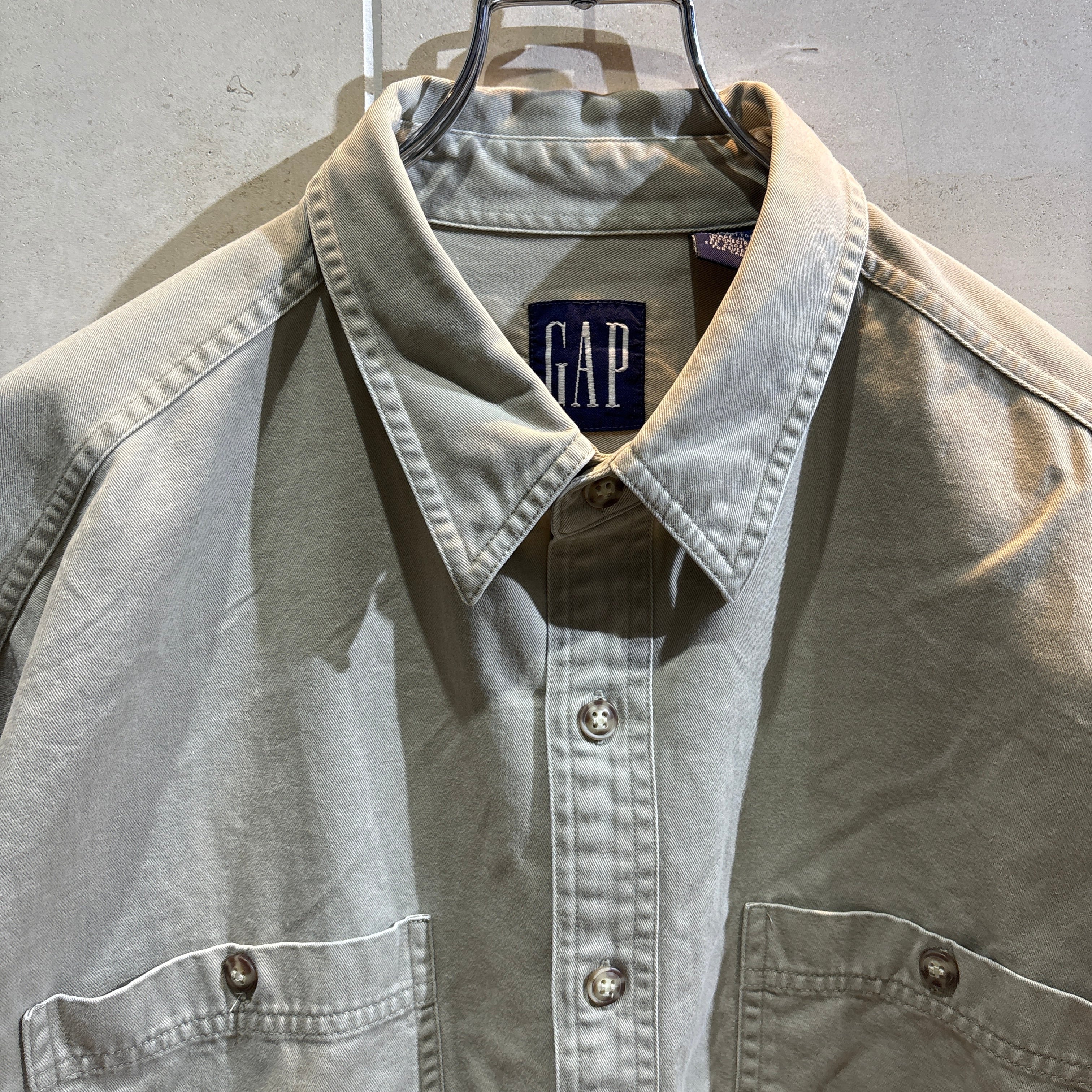 GAPの90年代ヘビーコットンシャツ。ワークシャツのような雰囲気で、ダブルポケット付き。色落ちやアタリの出方もヴィンテージならでは。ゆったりしたシルエットで羽織りとしてもおすすめです。