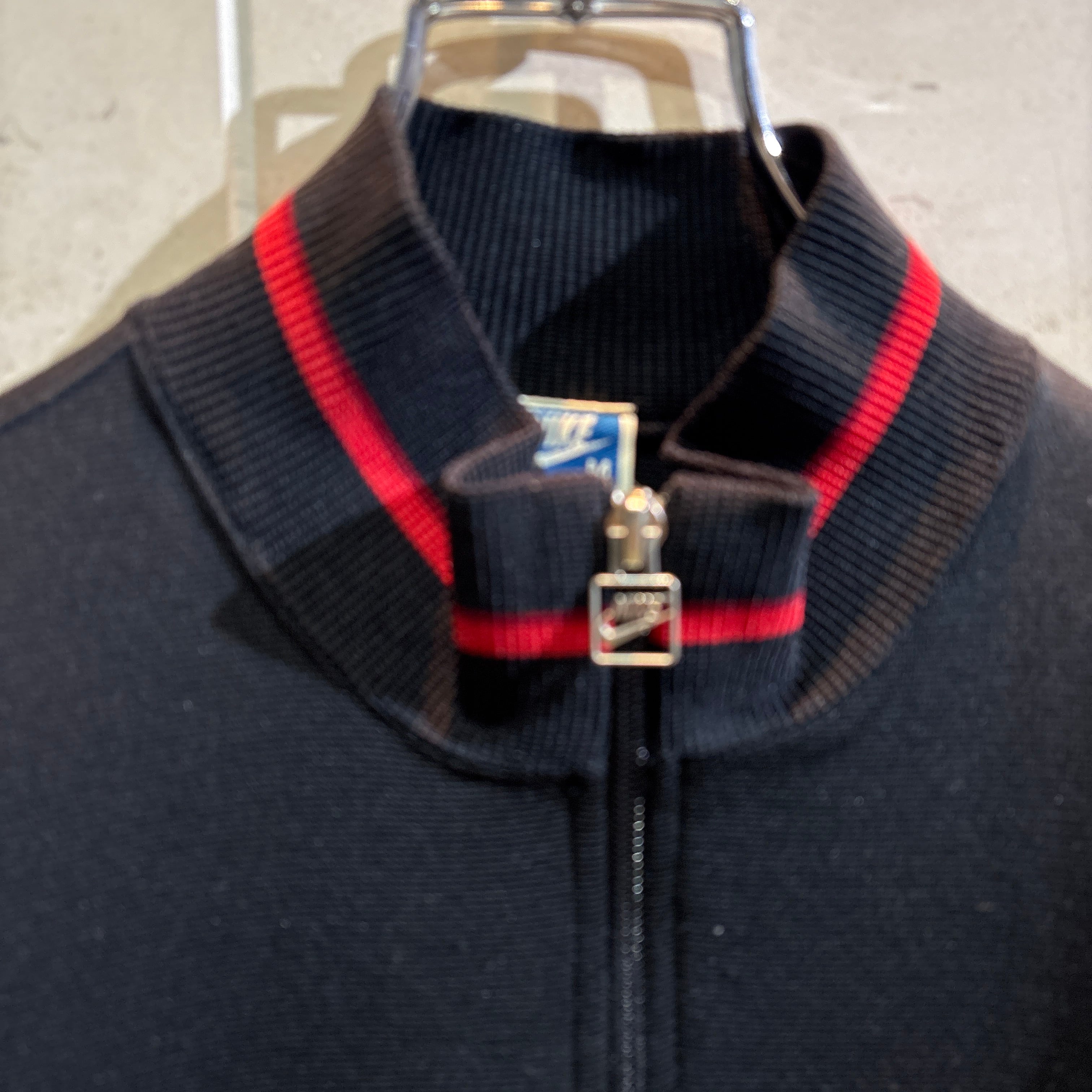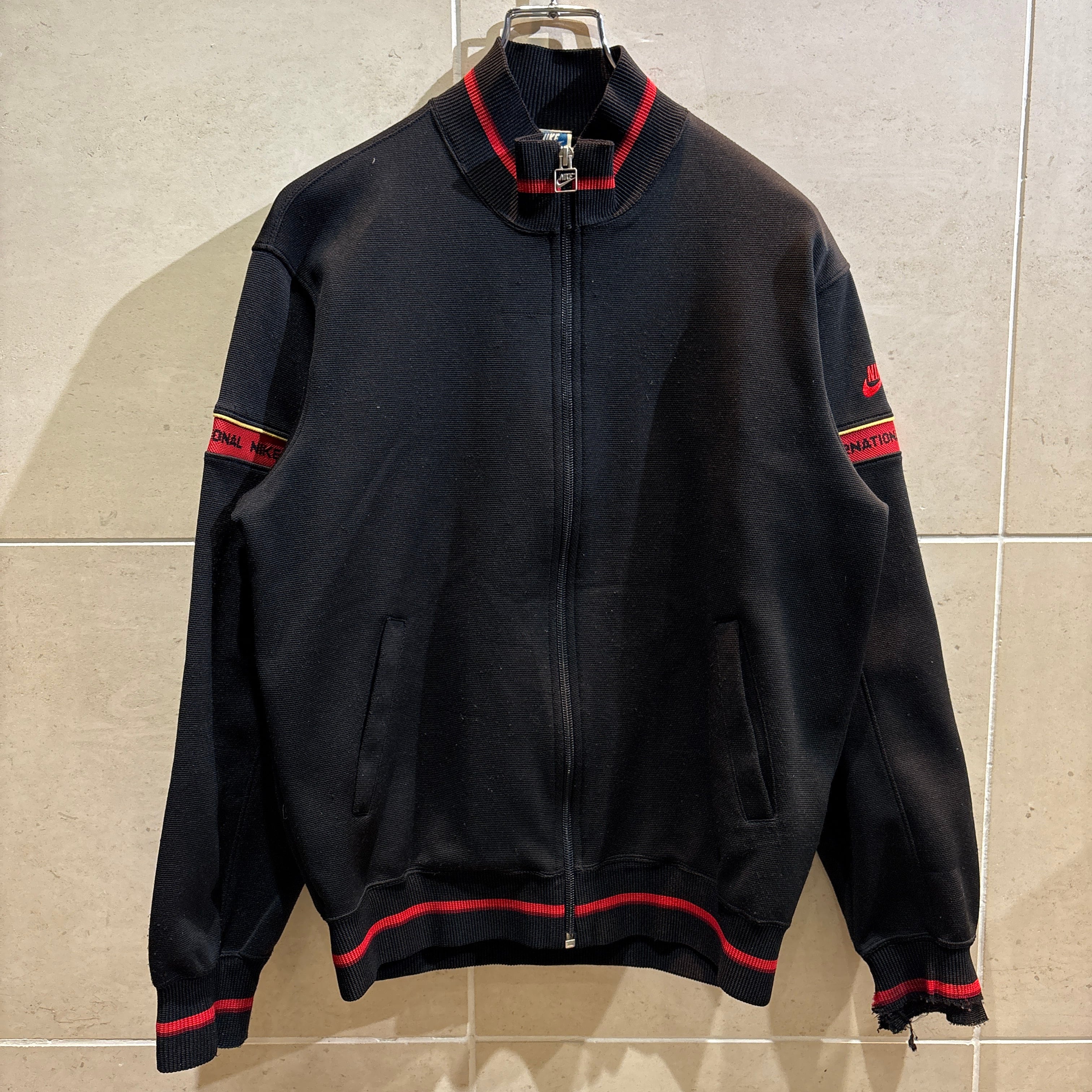 希少な日本製ナイキのトラックジャケット。ブラックベースに赤ラインが映えるスポーティーなデザインで、袖には「INTERNATIONAL NIKE」の刺繍入り。日本製ナイキタグが付く、コレクターにもおすすめの一着。