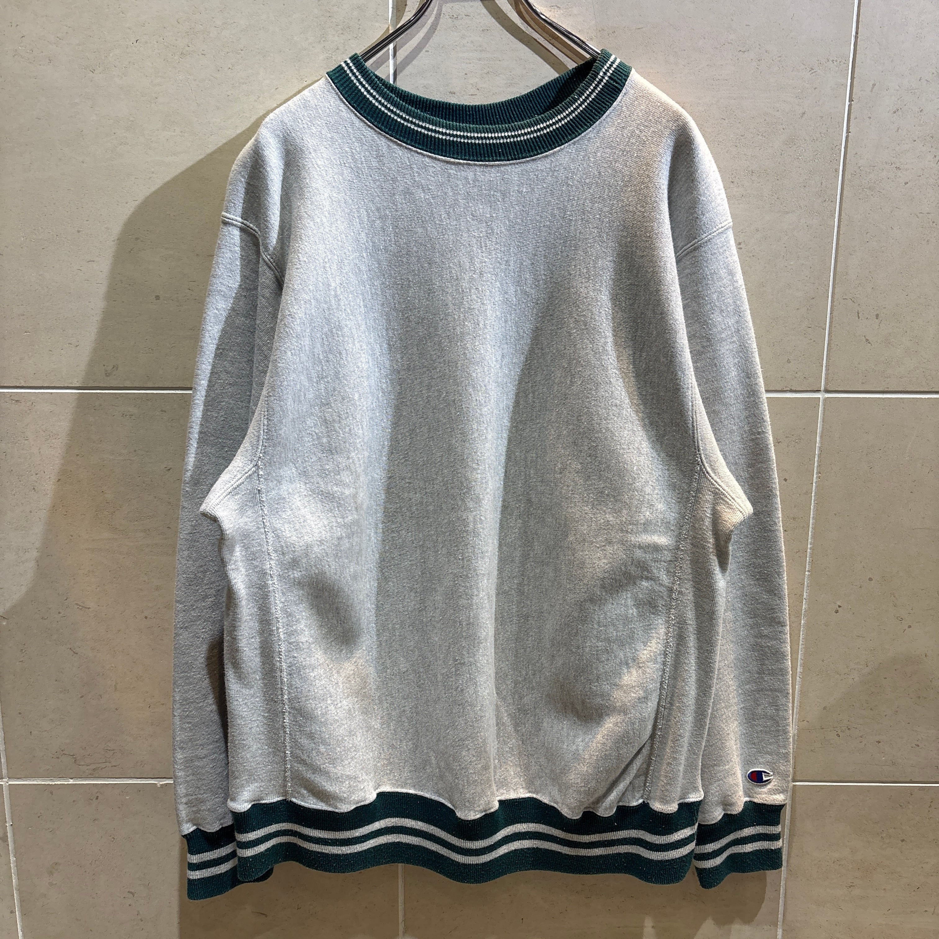 90年代USA製、チャンピオンのリバースウィーブスウェット。希少なリンガータイプで、ネックと裾・袖リブのグリーンラインがアクセントに。裏起毛の風合いも良く、程よくフェードしたグレーがヴィンテージ感を引き立てます。Lサイズ。