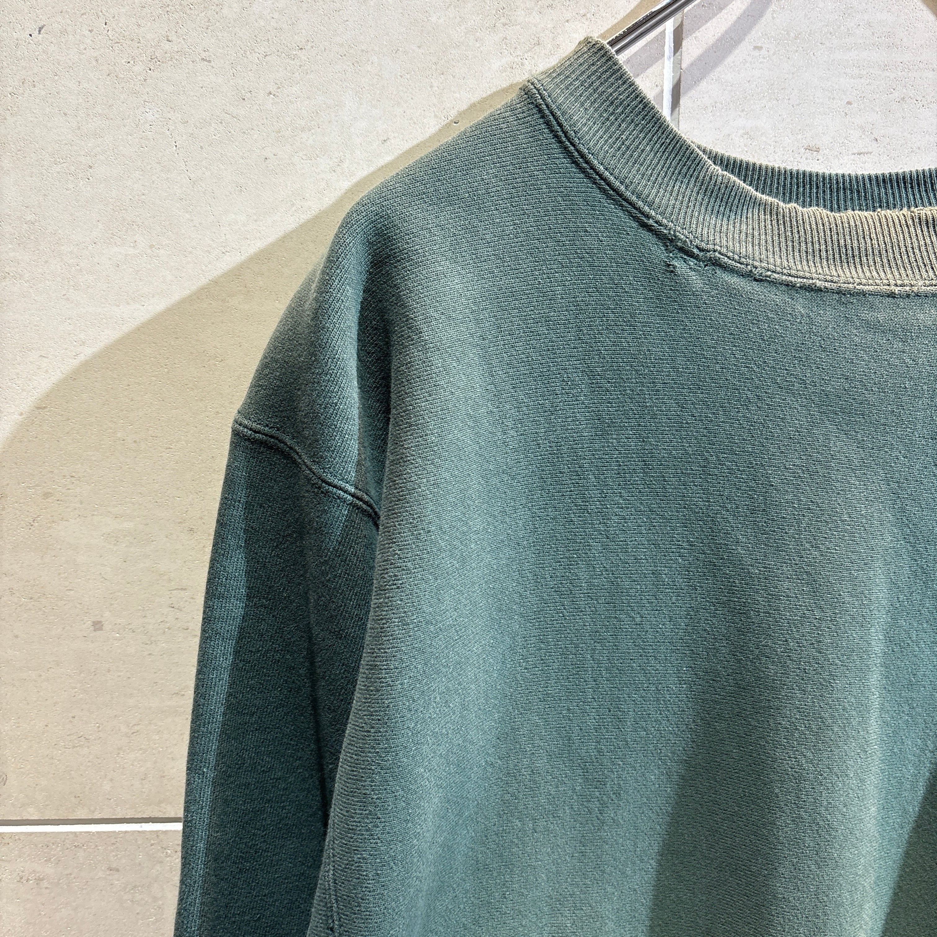 90年代USA製、チャンピオンのグリーン単色リバースウィーブ。タグに「ASSEMBLED IN MEXICO」表記があり、移行期のレアモデル。無地だからこそ色褪せたグリーンのフェードが映える一枚。Lサイズ。
