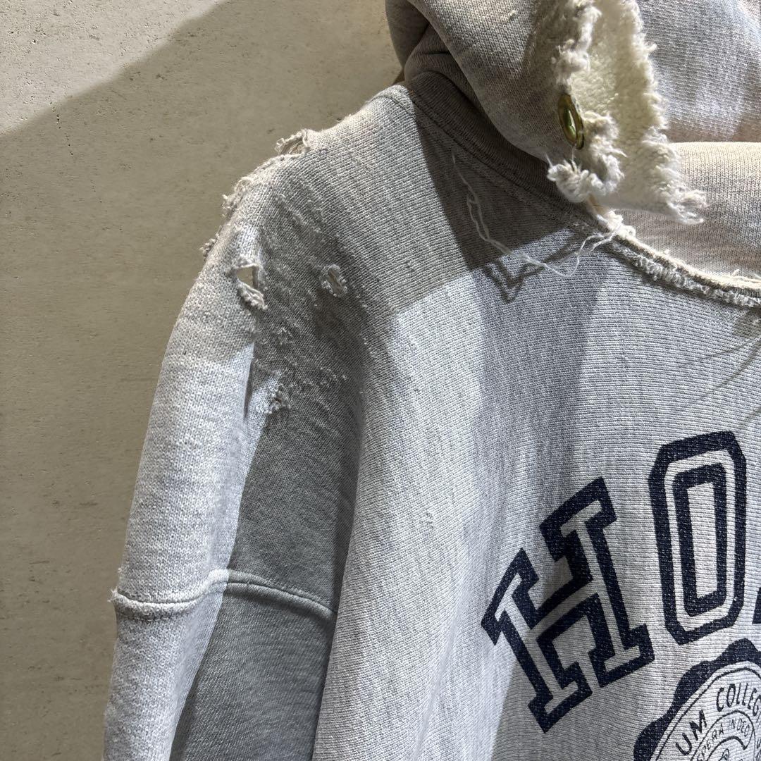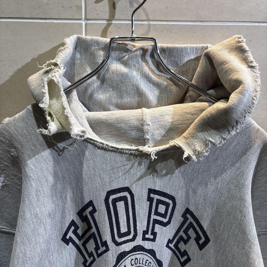 HOPE COLLEGEのアンカーロゴ入りプリント。フードや裾のダメージが強く、かなりグランジ感のあるエイジング。ボロの美学。無骨で雰囲気のある個体を探している方におすすめの一点。